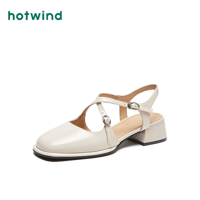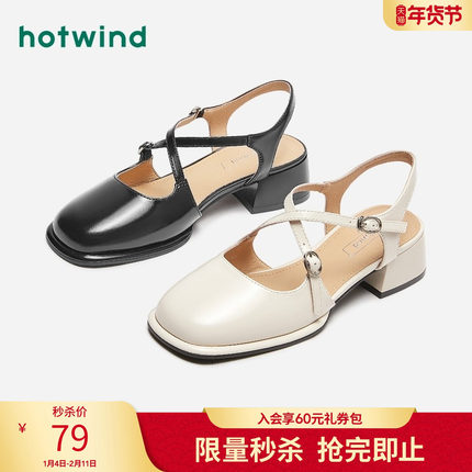 热风秋季新款女士时尚粗跟一字式扣带包头凉鞋百搭休闲鞋