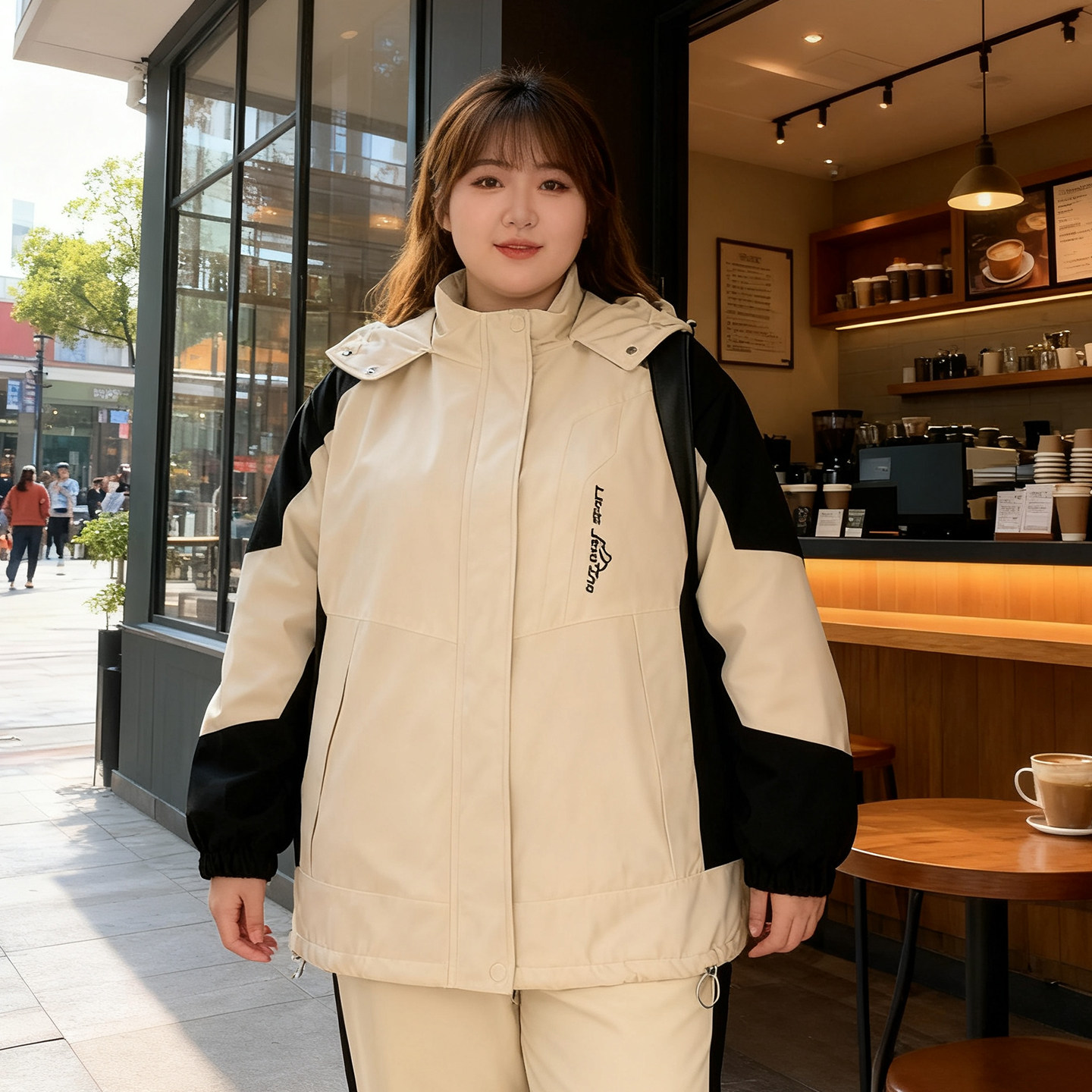 大码女装胖mm工装风连帽棉服女宽松夹棉加厚撞色休闲保暖棉衣外套