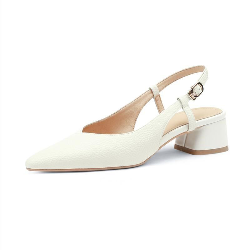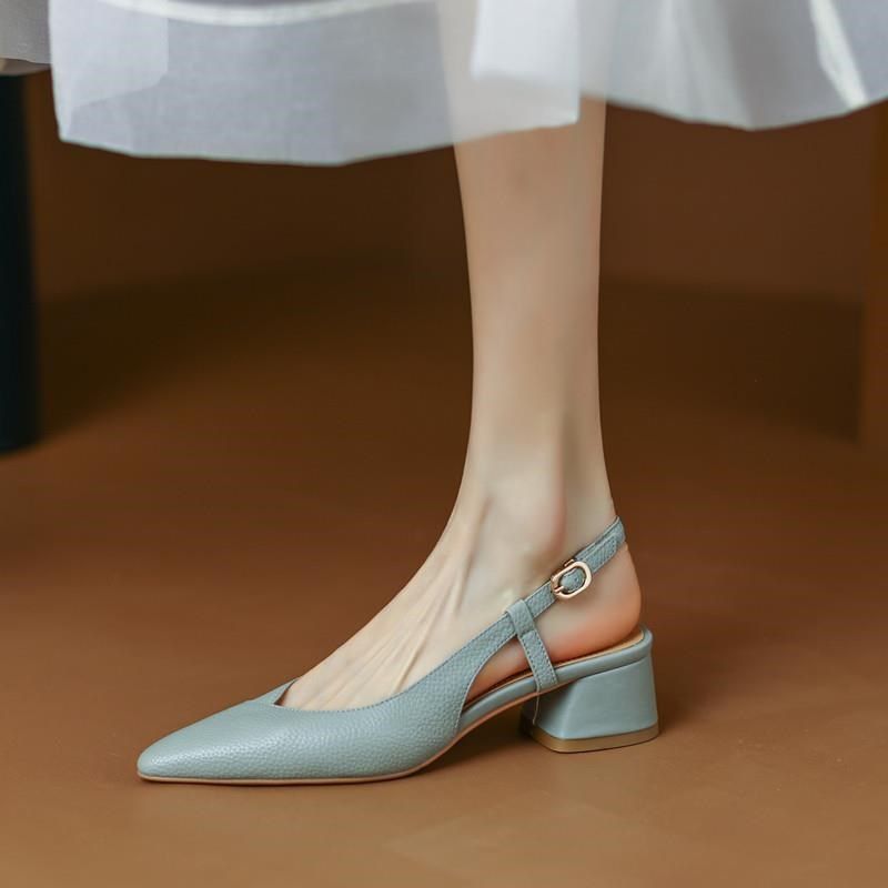 真皮通勤简约一字带尖头后空粗跟单鞋百搭中跟包头凉鞋女夏季软皮
