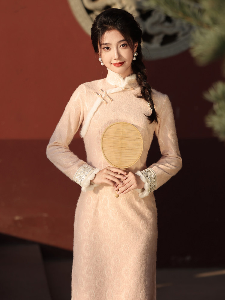 粉色旗袍2025冬季年轻款长袖加厚保暖温柔少女新中式蕾丝连衣裙