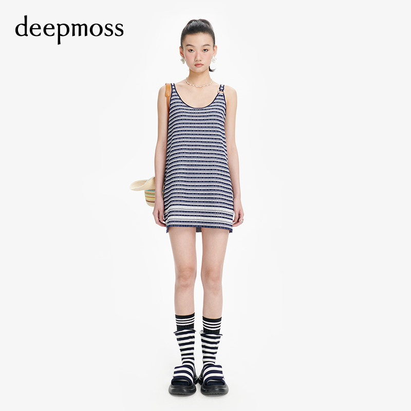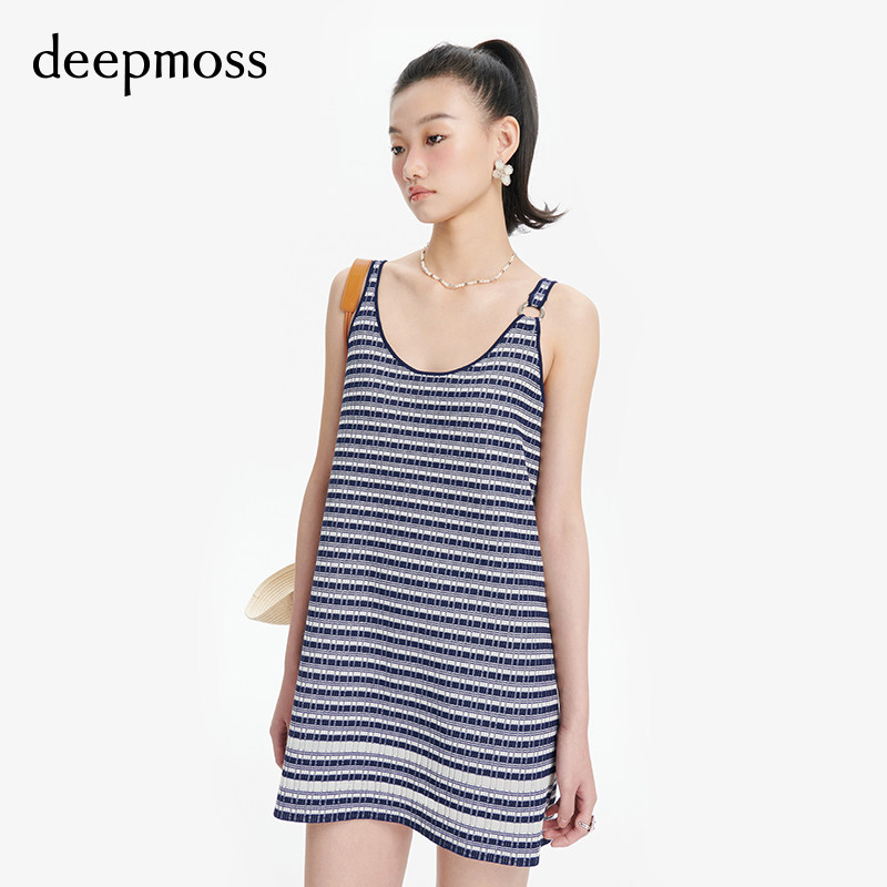 【deepmoss】条纹A字背心裙女时尚复古潮流金属环短款连衣裙