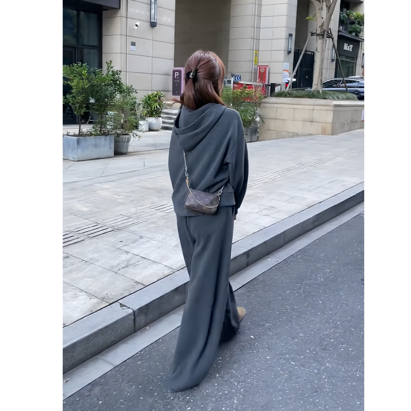 巨好看的秋装一整套慵懒风灰色连帽卫衣外套阔腿裤休闲运动套装女