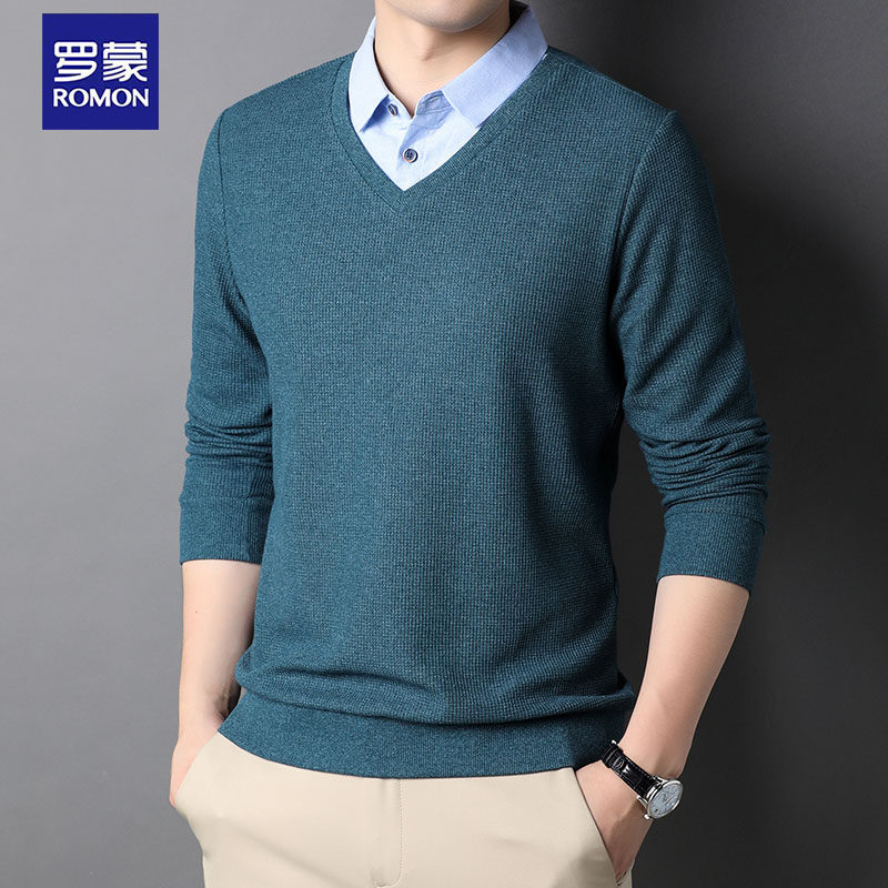 罗蒙长袖t恤男秋季2025新款商务休闲男士衬衫领假两件针织Polo衫
