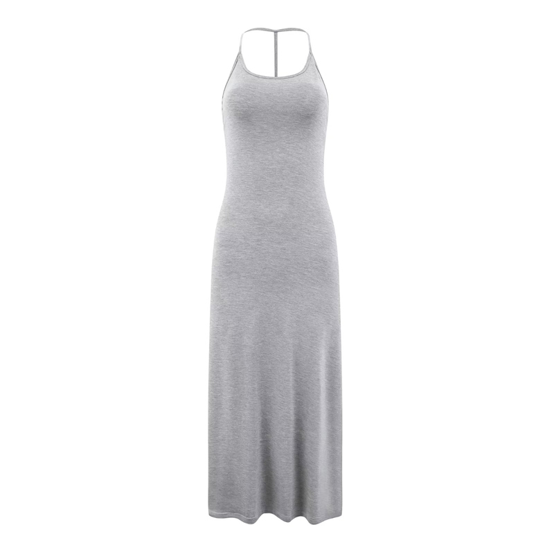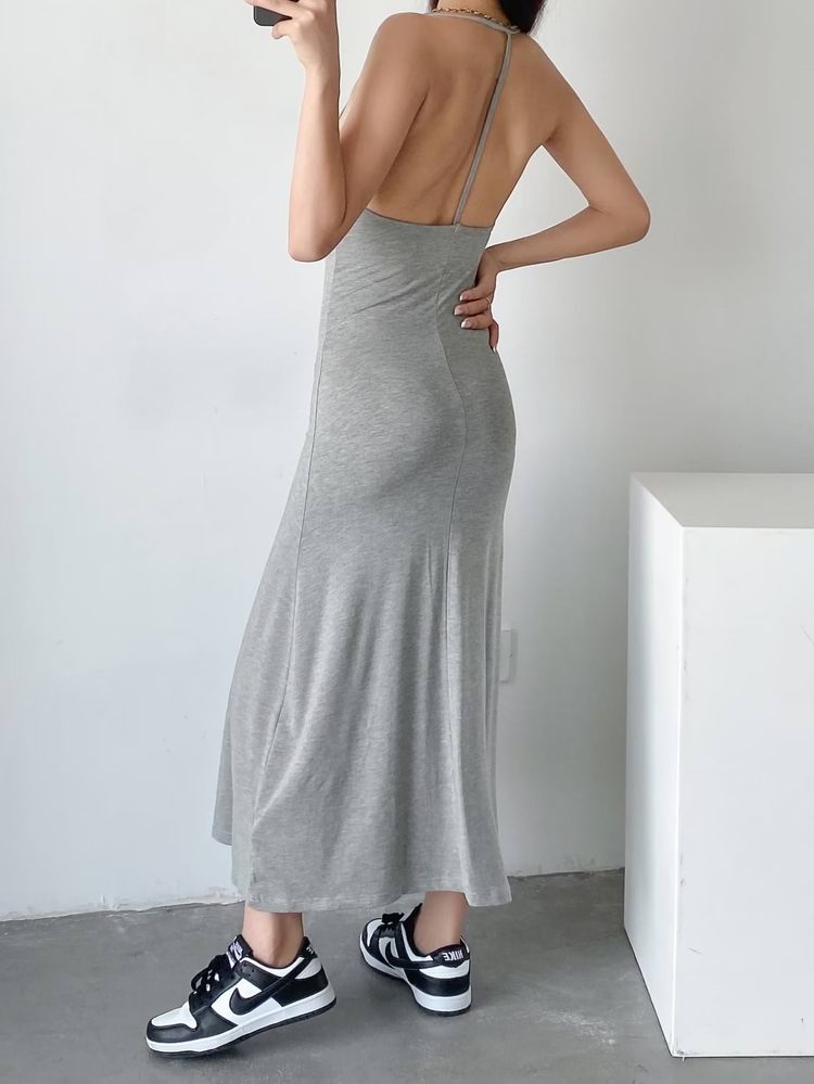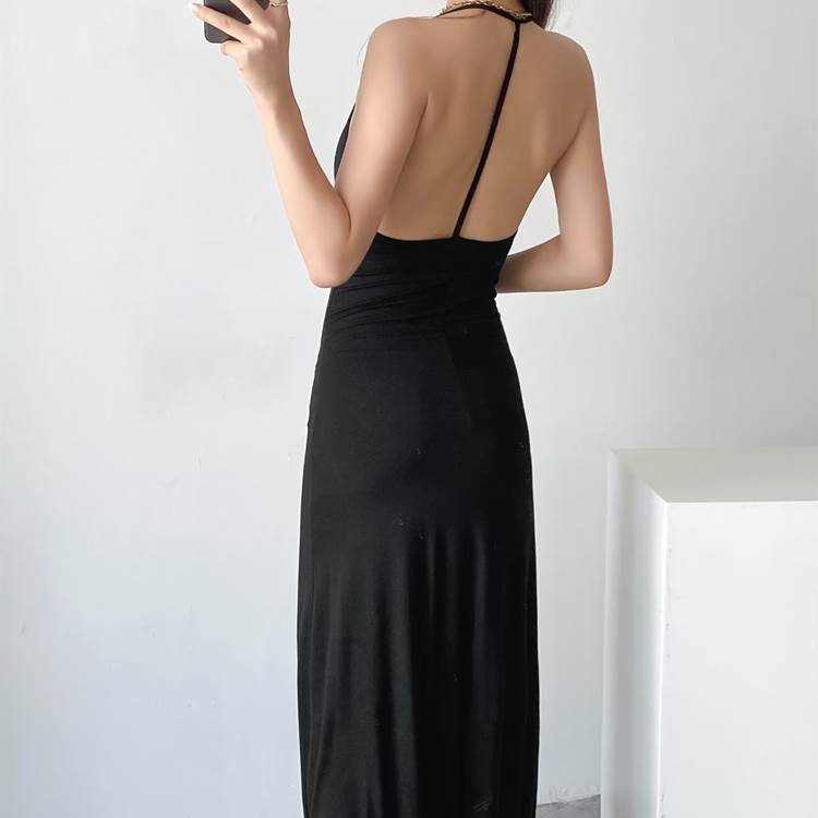 欧美纯色性感大露背挂脖连衣裙女夏季修身显瘦无袖包臀裙打底长裙