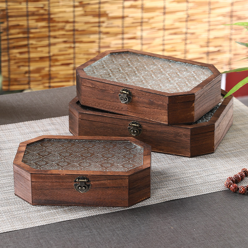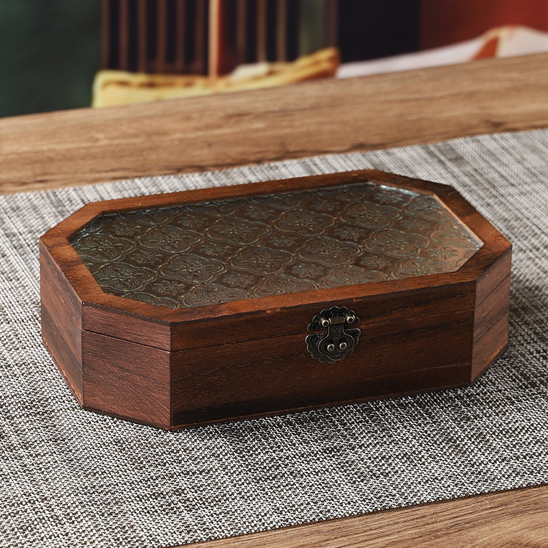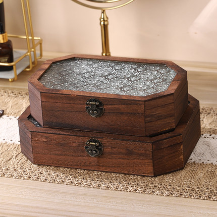 中式古典海棠花玻璃木质收纳盒