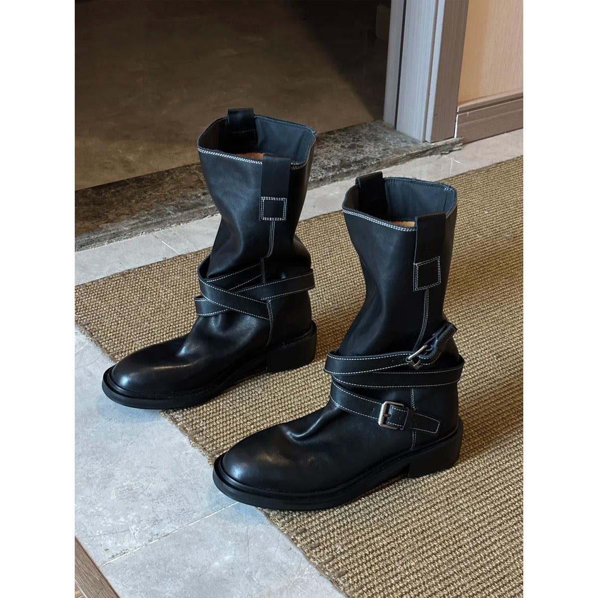 羊皮版~复古皮带扣中筒靴西部牛仔靴显瘦厚底炸街短靴女骑士靴子
