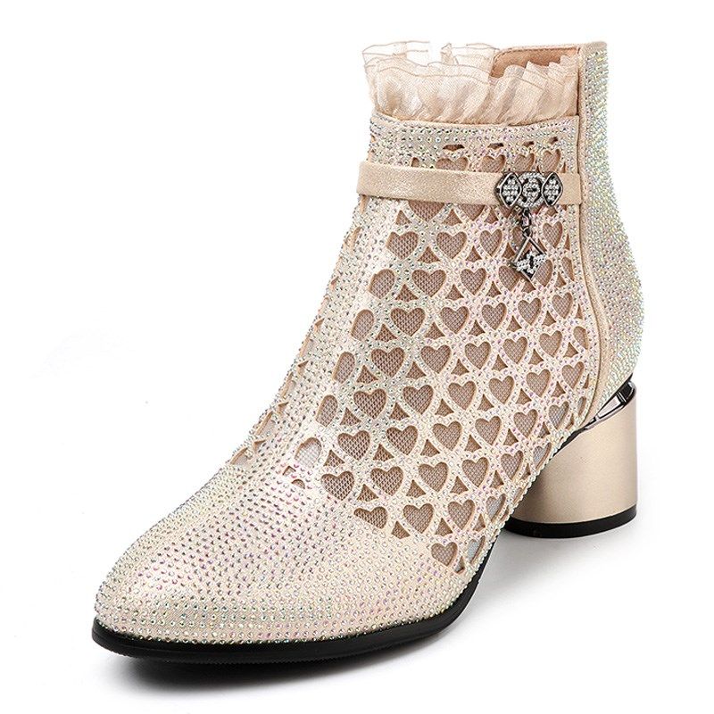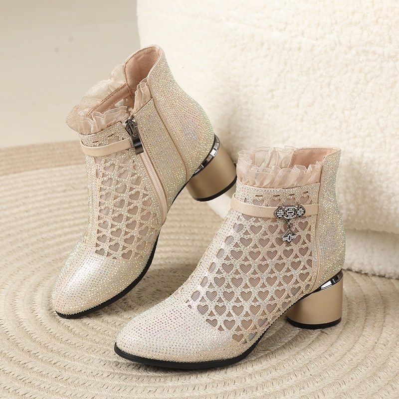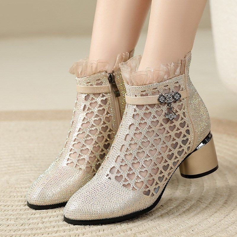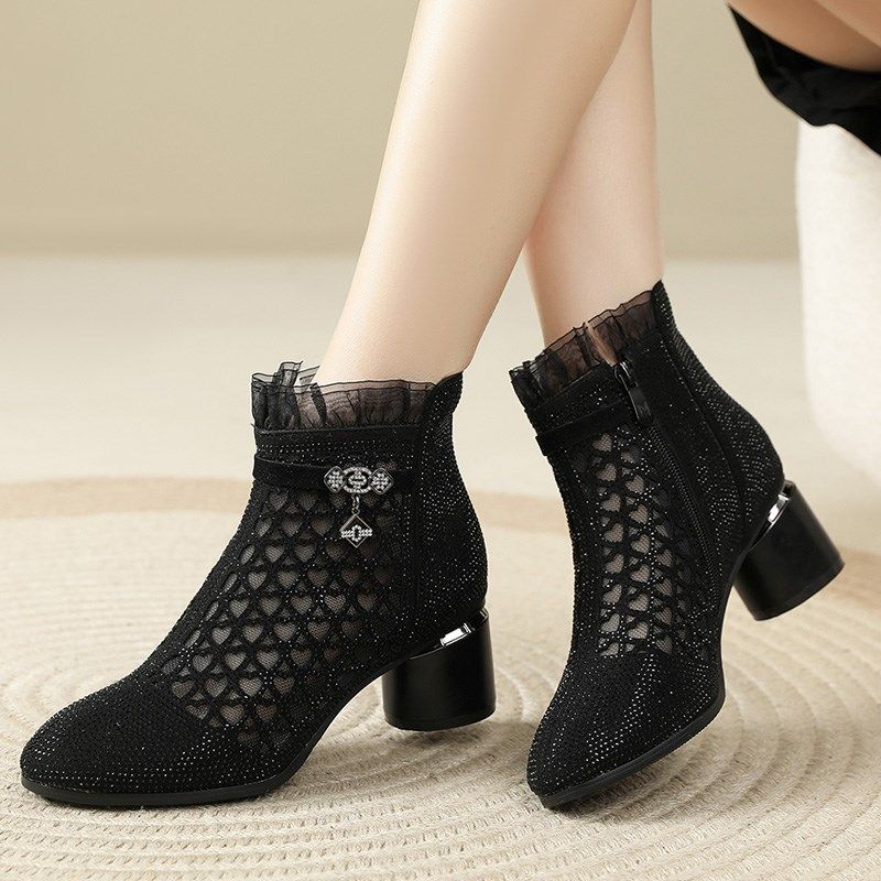 网靴女春秋短靴2025新款夏凉靴水钻中跟软底网纱靴时尚凉鞋妈妈鞋
