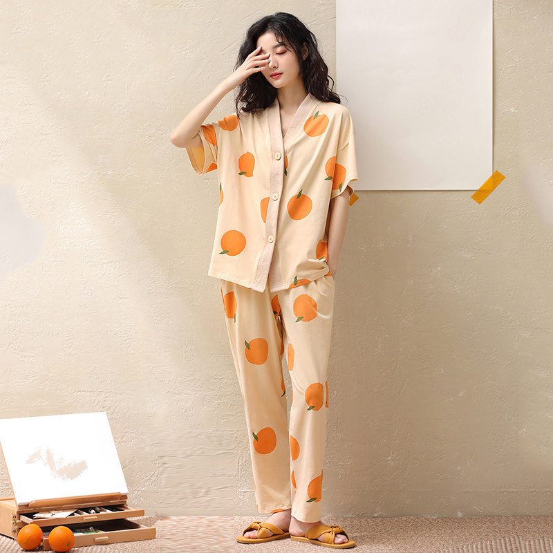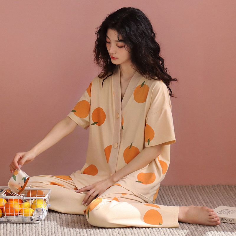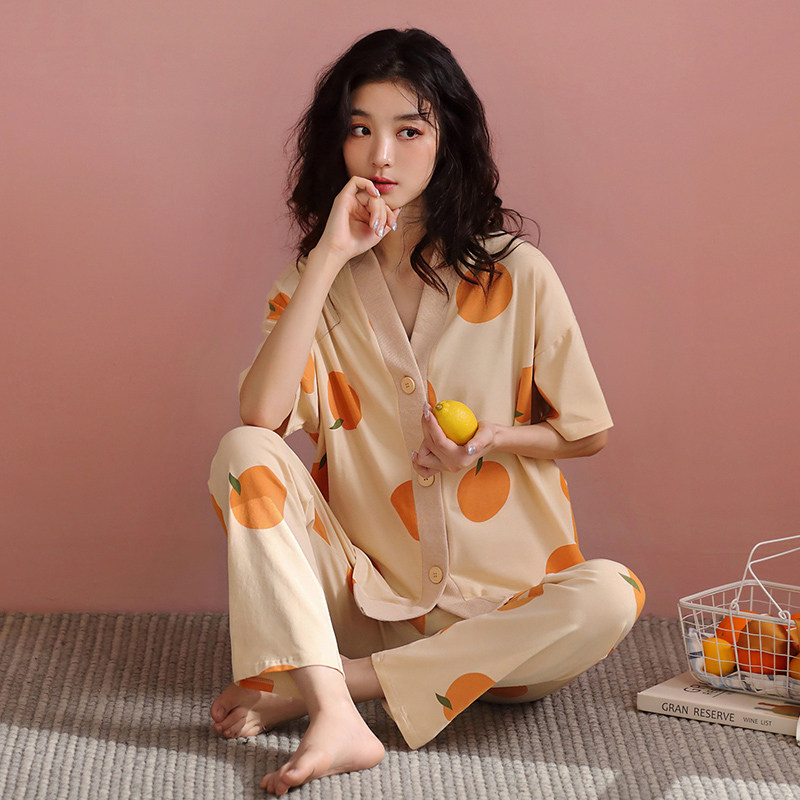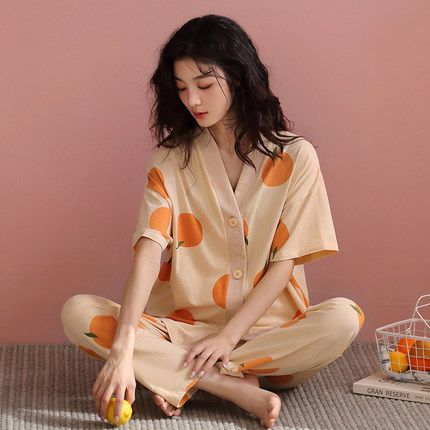 女士睡衣春夏季薄款纯棉短袖长裤月子开衫甜美家居服夏天宽松套装