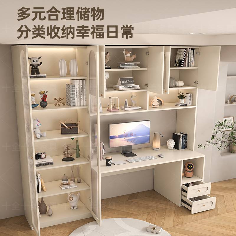 W8书桌书架一体桌奶油风带书柜组合学生学习桌家用办公桌台式电脑