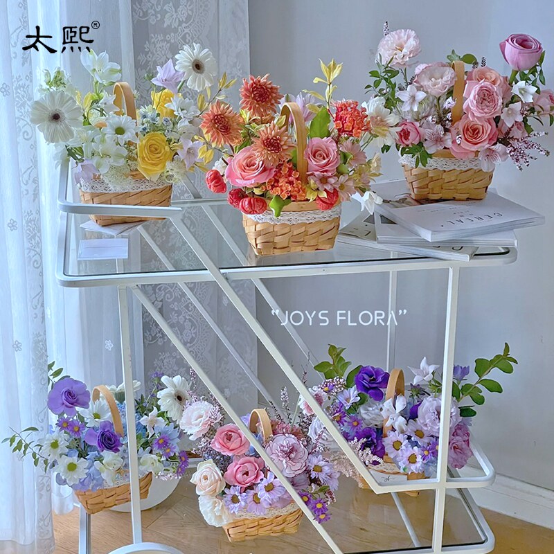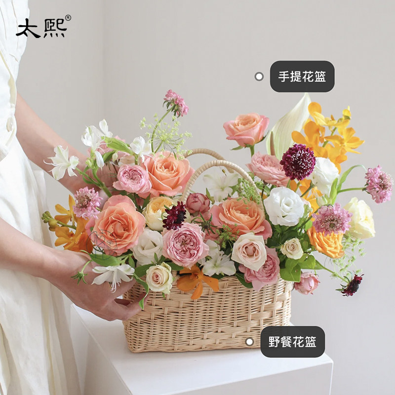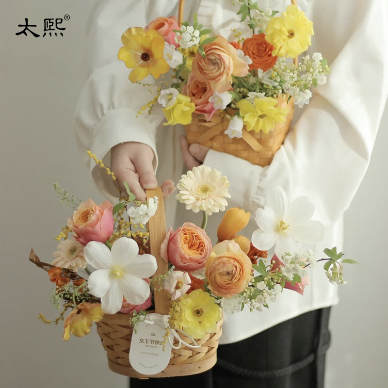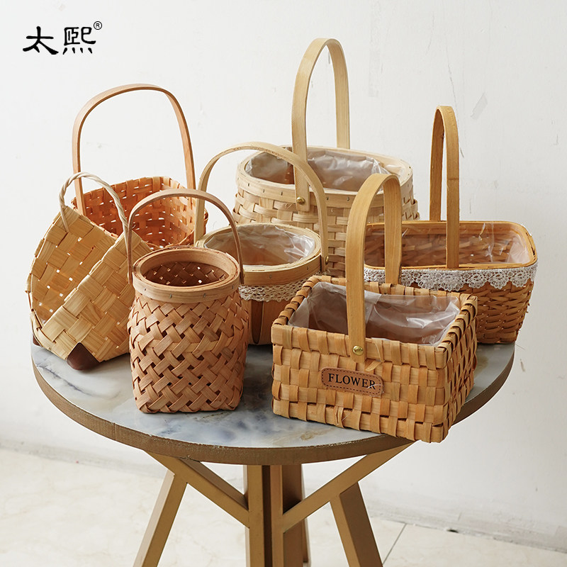 三八女神木片鲜花篮蕾丝边手提插花竹花盆实木手提花篮伴手花礼篮