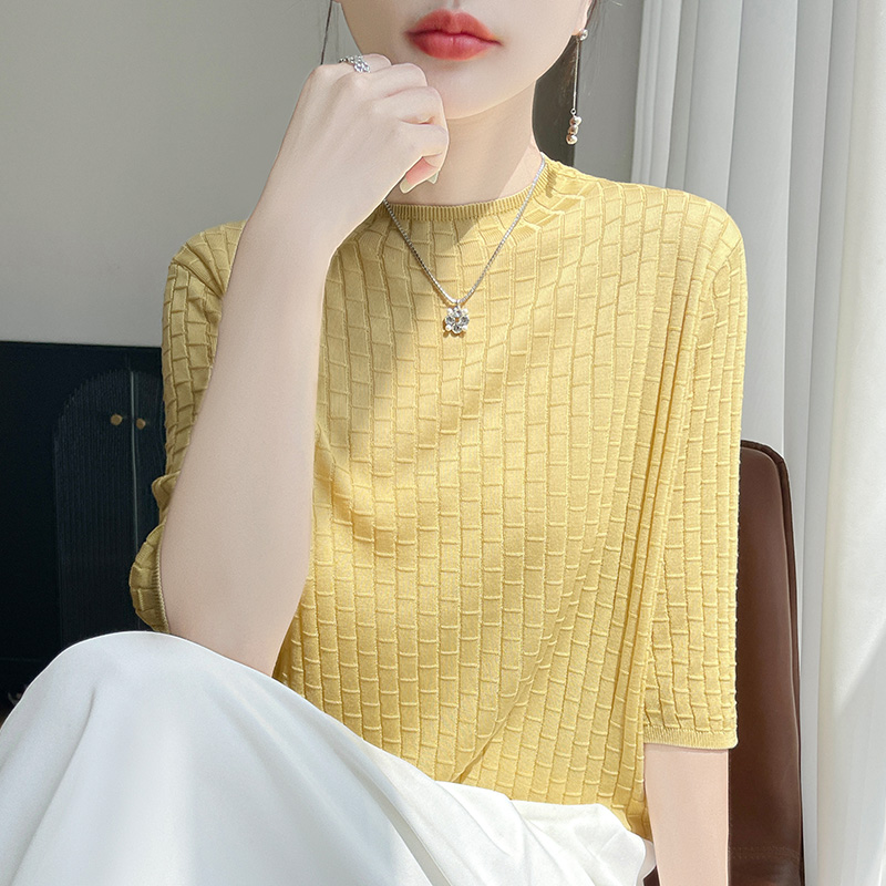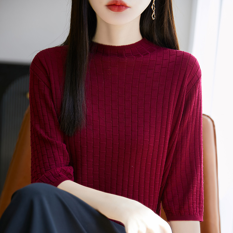 100%莱赛尔天丝针织五分袖上衣女半高领提花短袖T恤宽松中袖打底