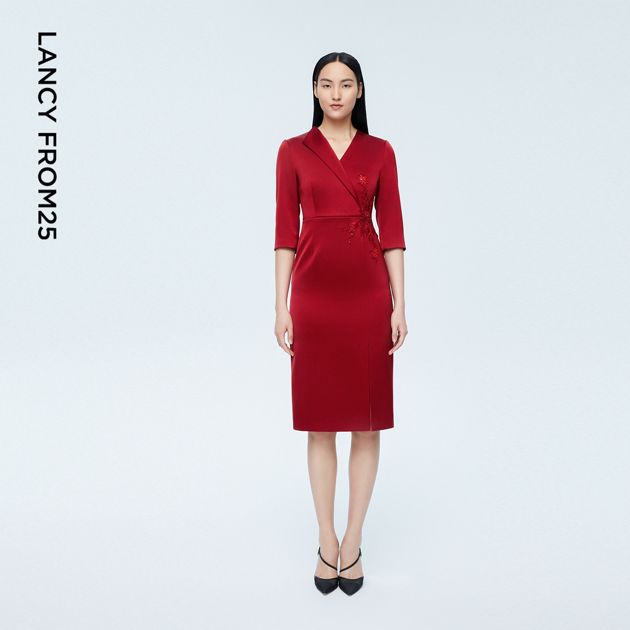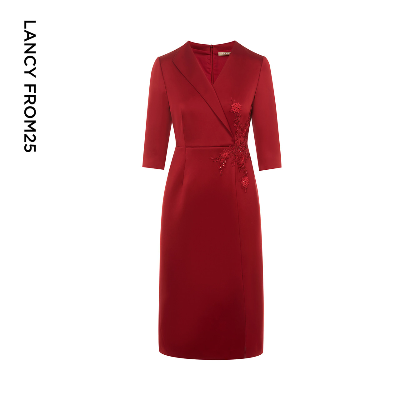 LANCY/朗姿2023夏季新款中长款宴会婚礼礼服中长款收腰红色连衣裙