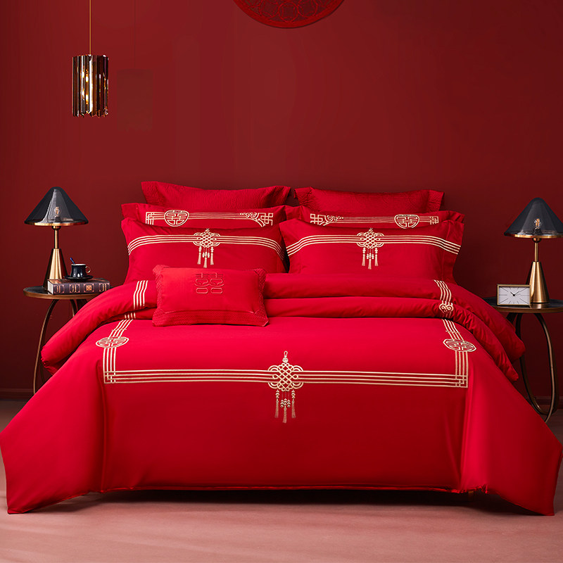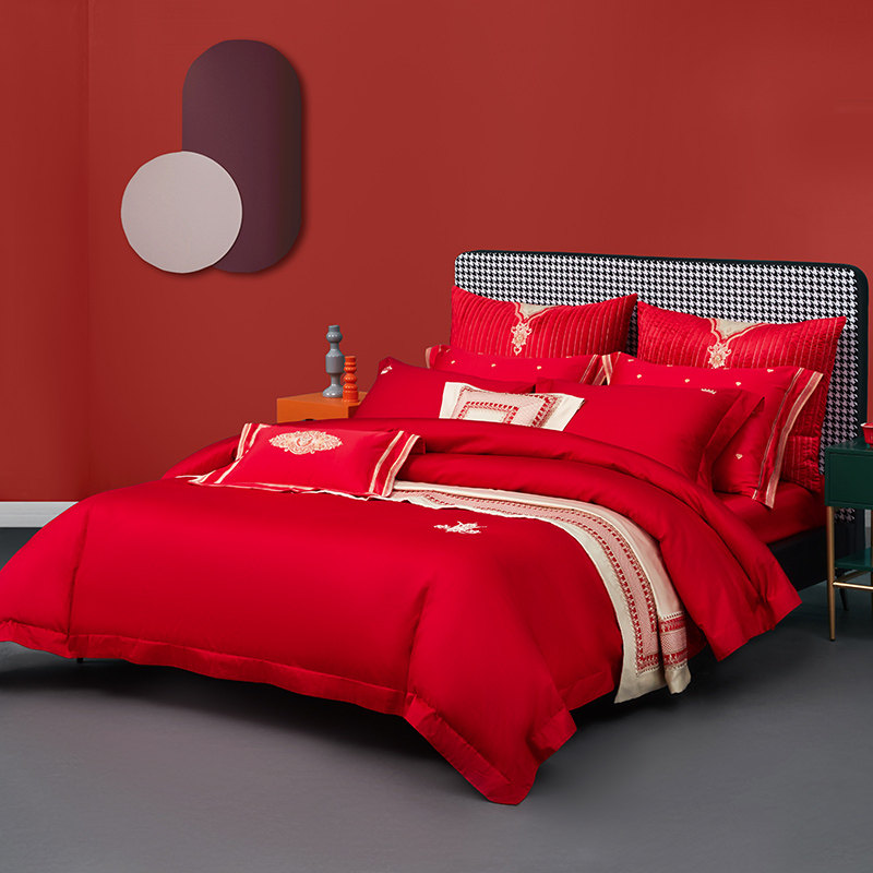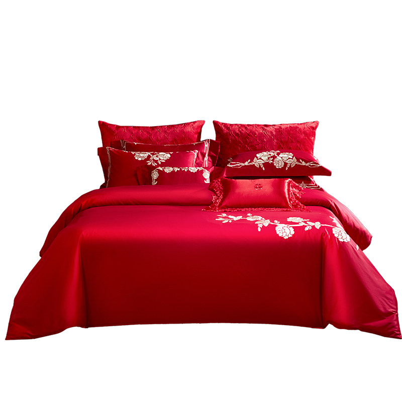 梦洁家纺60s贡缎刺绣纯棉婚庆四件套大红色新婚全棉结婚248x248cm