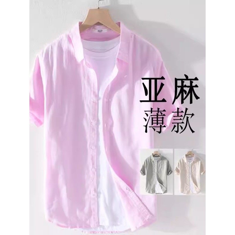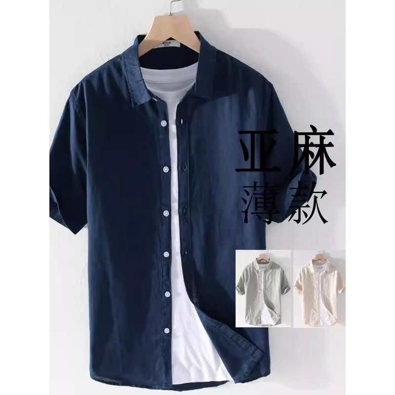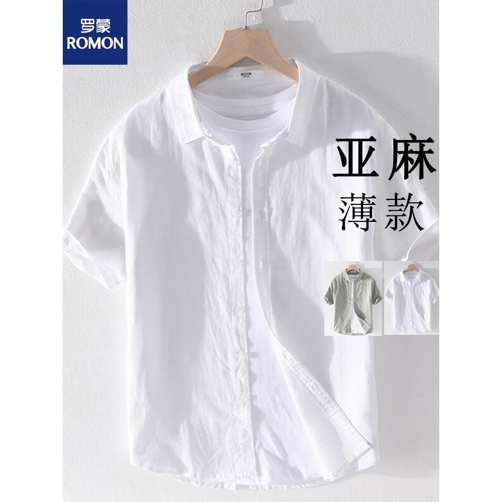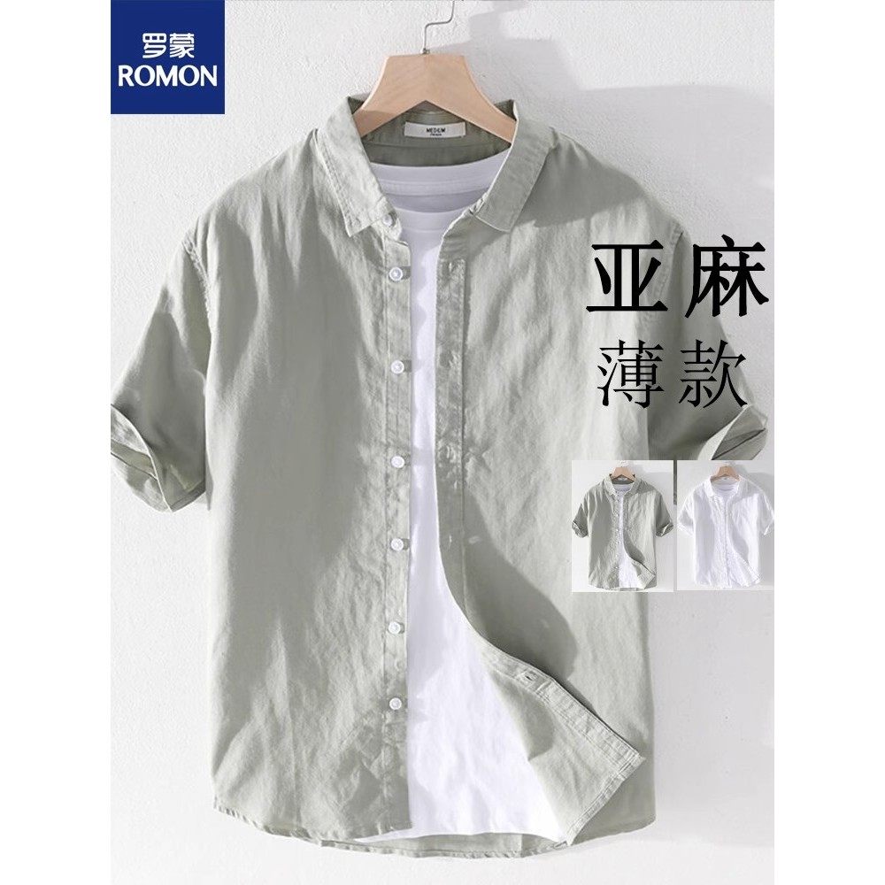 罗蒙男士亚麻短袖衬衫夏季薄款日系休闲宽松棉麻衬衣外套五分寸衫