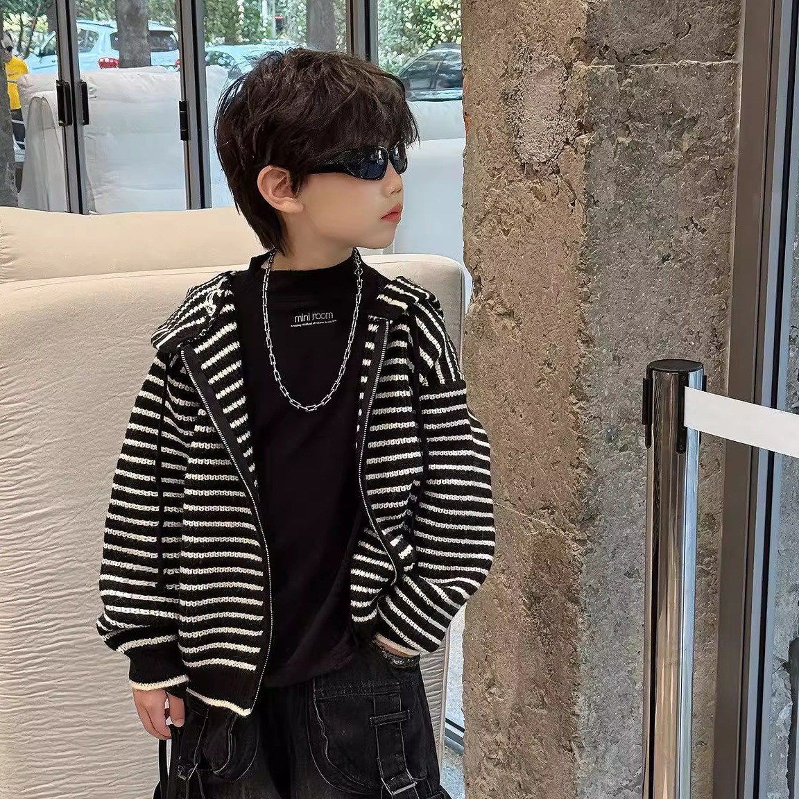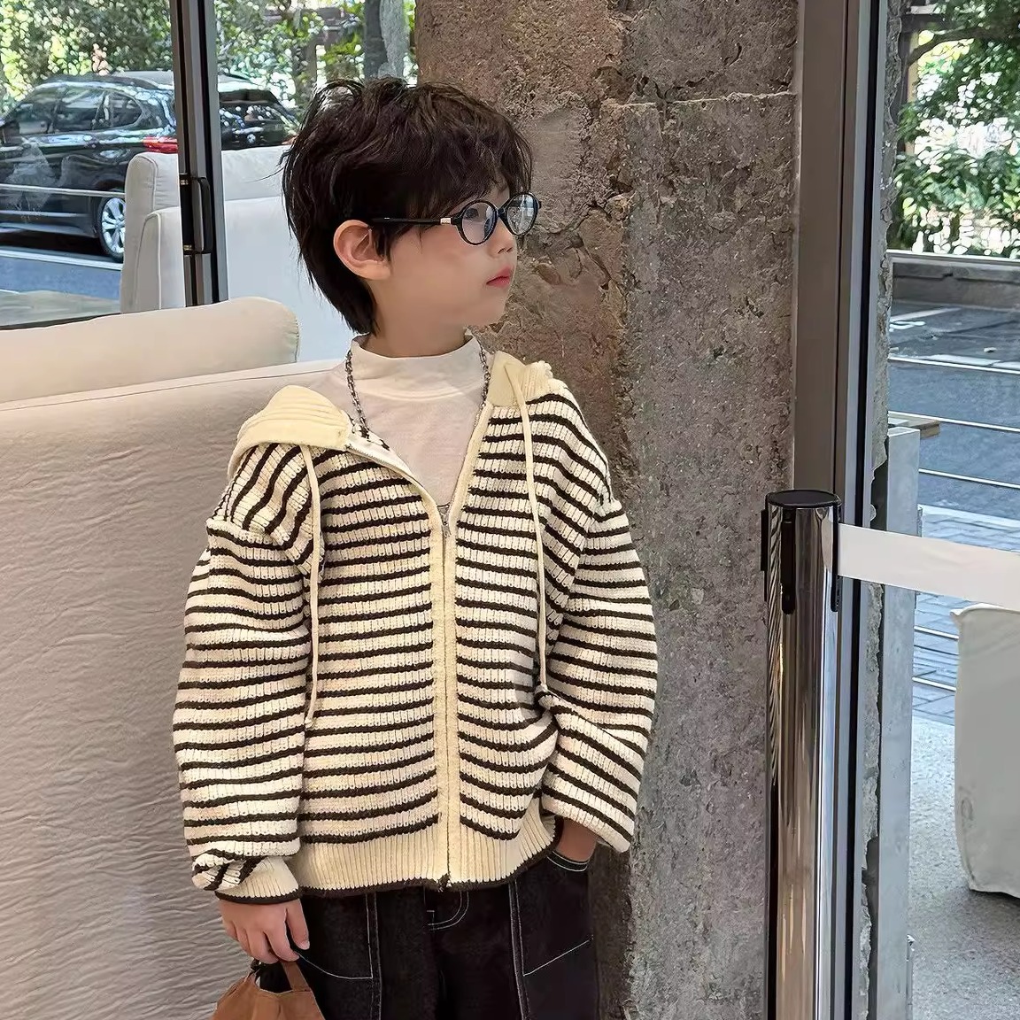 百搭~男童条纹连帽针织开衫春秋款儿童毛衣外套秋冬童装女童装潮
