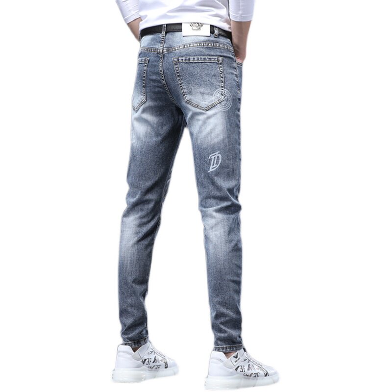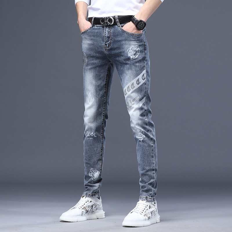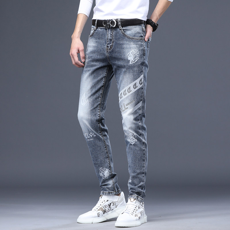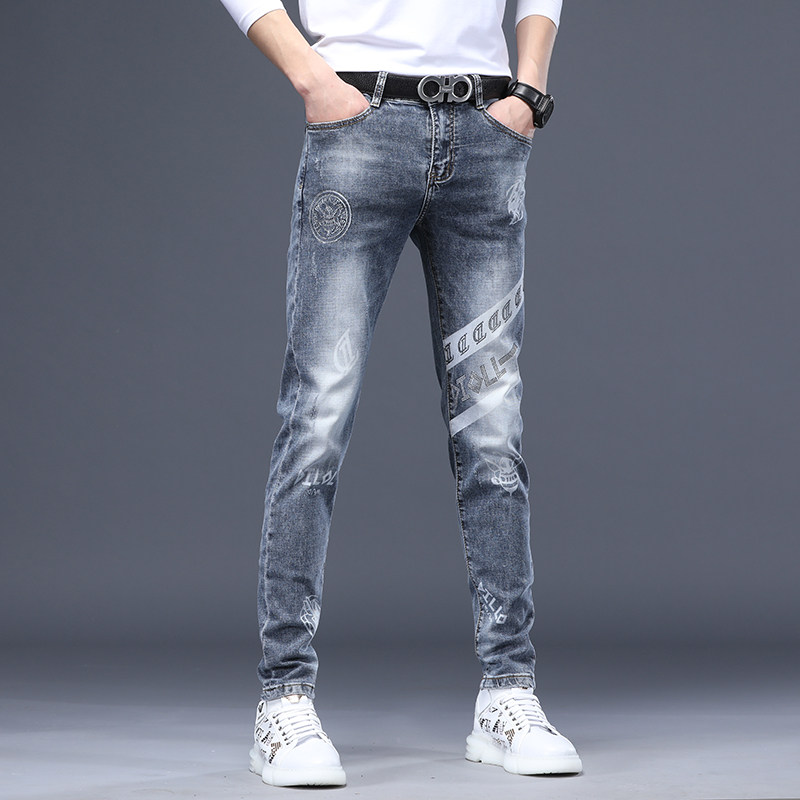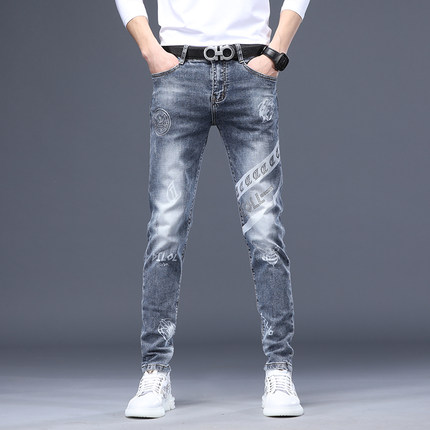 2025秋季新款欧货高端印花牛仔裤男潮牌修身小脚弹力直筒休闲长裤