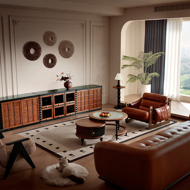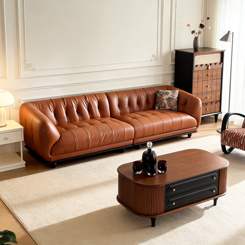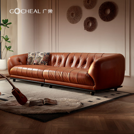 广巢柯茵复古风实木真皮沙发头层牛皮中古客厅直排三人位软包皮艺