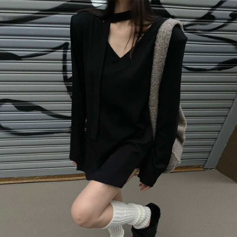 灰色v领t恤女长袖加厚磨毛打底衫飘带宽松长款遮屁股纯棉垫肩上衣