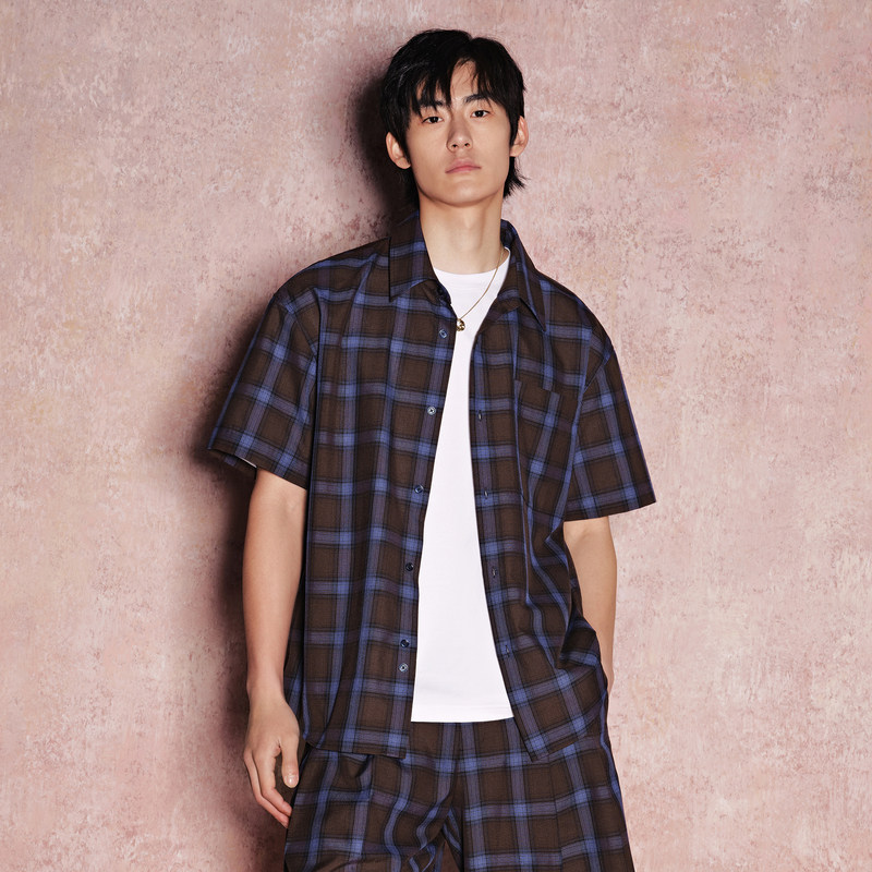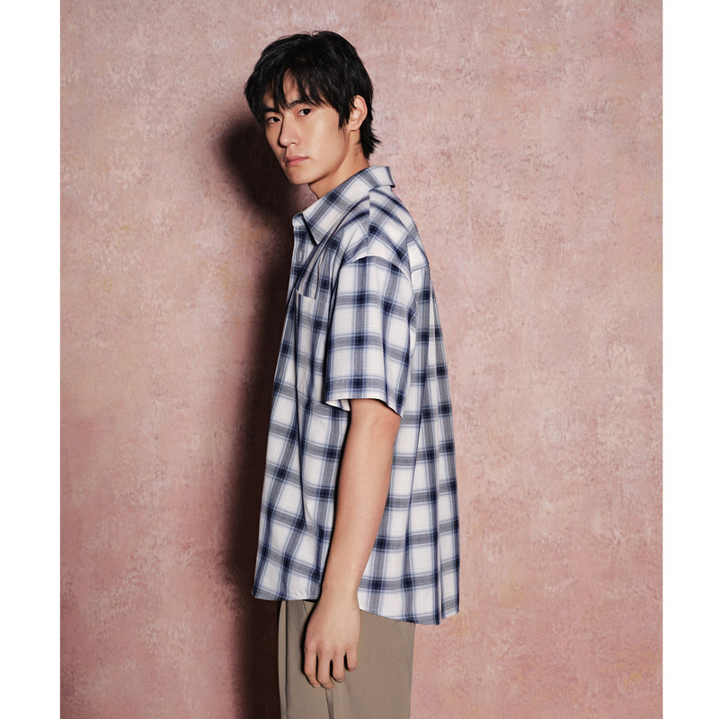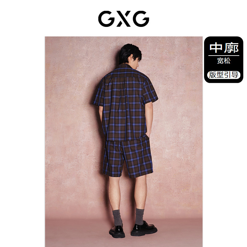 GXG男装 格纹设计休闲复古翻领短袖衬衫男士上衣 24年夏季品