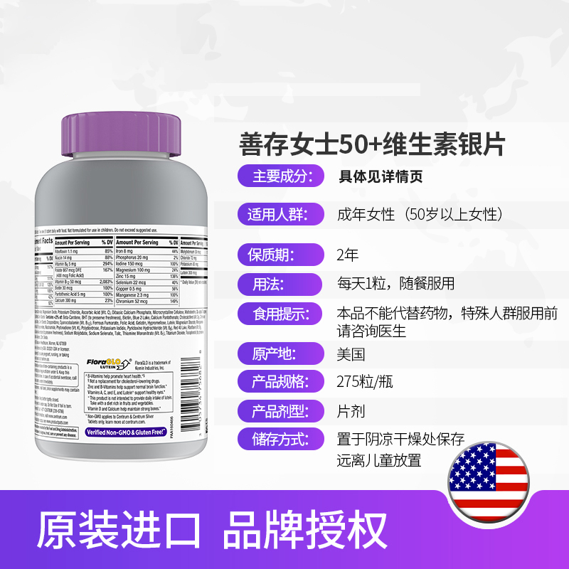 美国善存银片女士50岁中老年复合维生素B族d3多维片含烟酰胺275粒