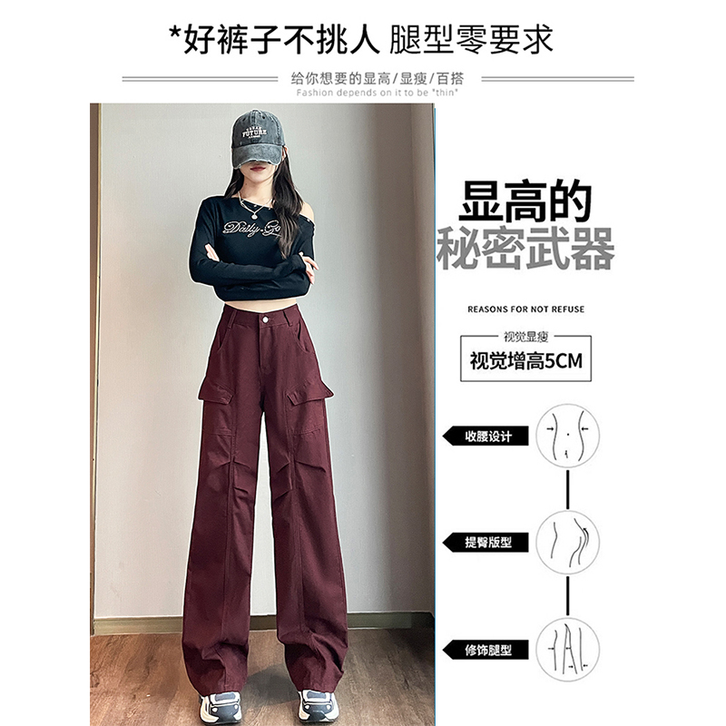 酒红色高端工装裤女阔腿牛仔裤2025秋冬新款褶皱设计感时髦休闲裤