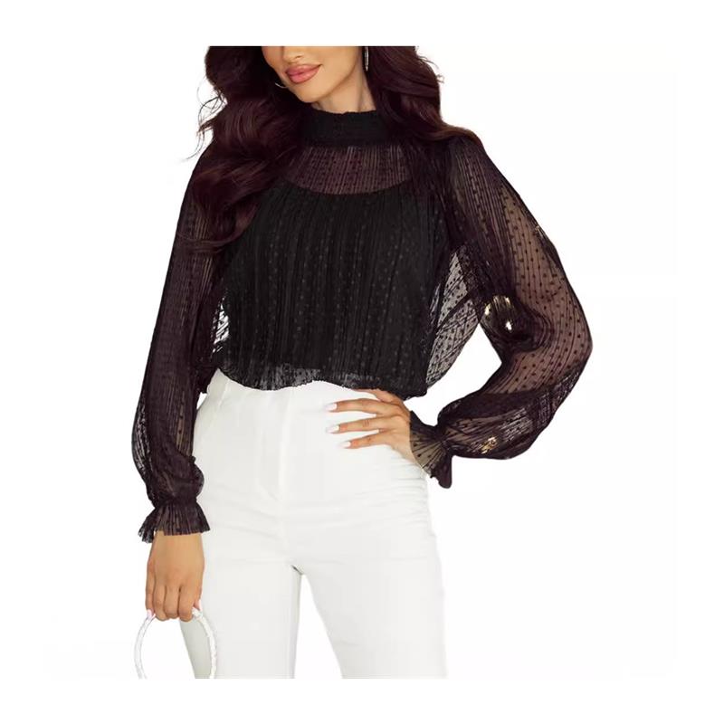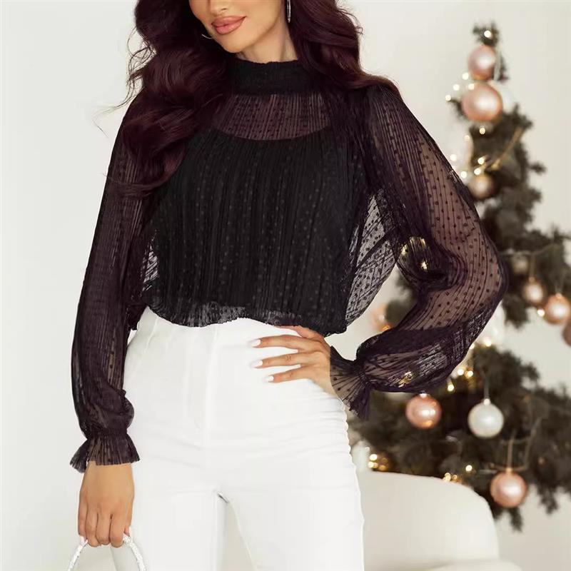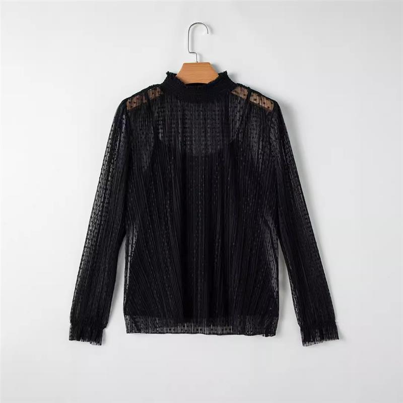 秋季新款性感透视雪纺衫女欧美气质百搭立领长袖套头女式上衣
