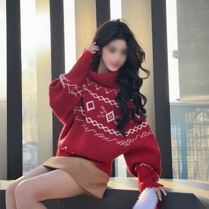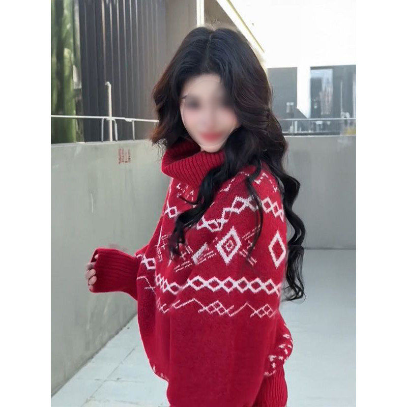 甜妹时尚风蝙蝠袖高领套头费尔岛毛衣女新年红宽松休闲针织衫上衣