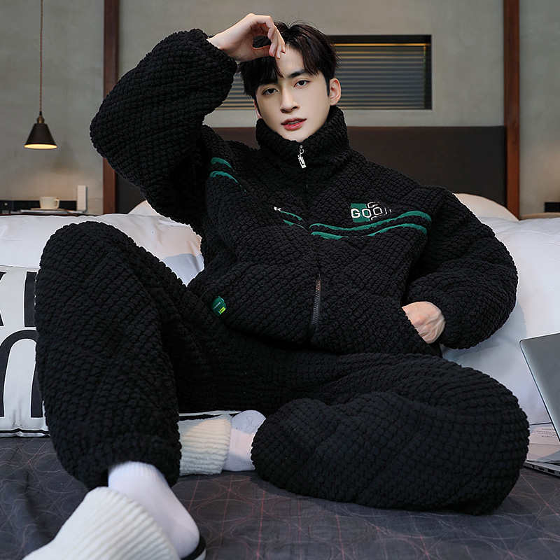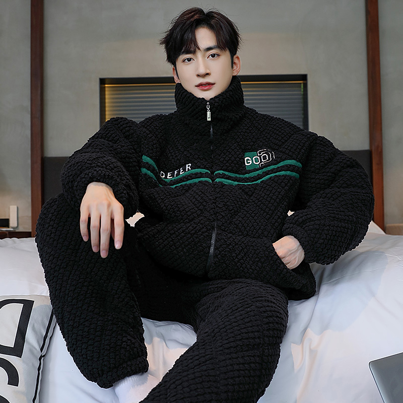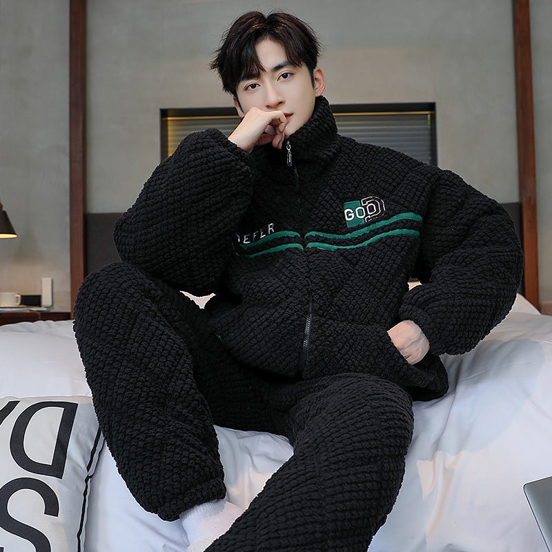 珊瑚绒睡衣男士秋冬季三层夹棉袄加厚加绒2023新款冬天家居服套装