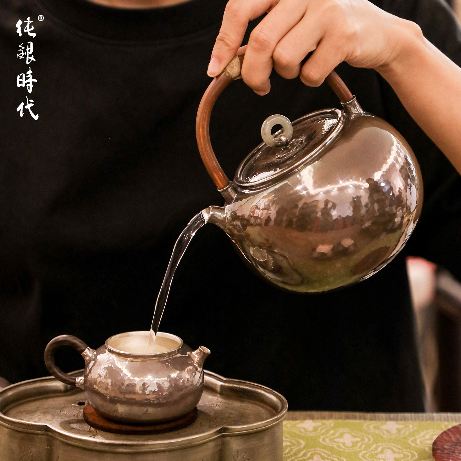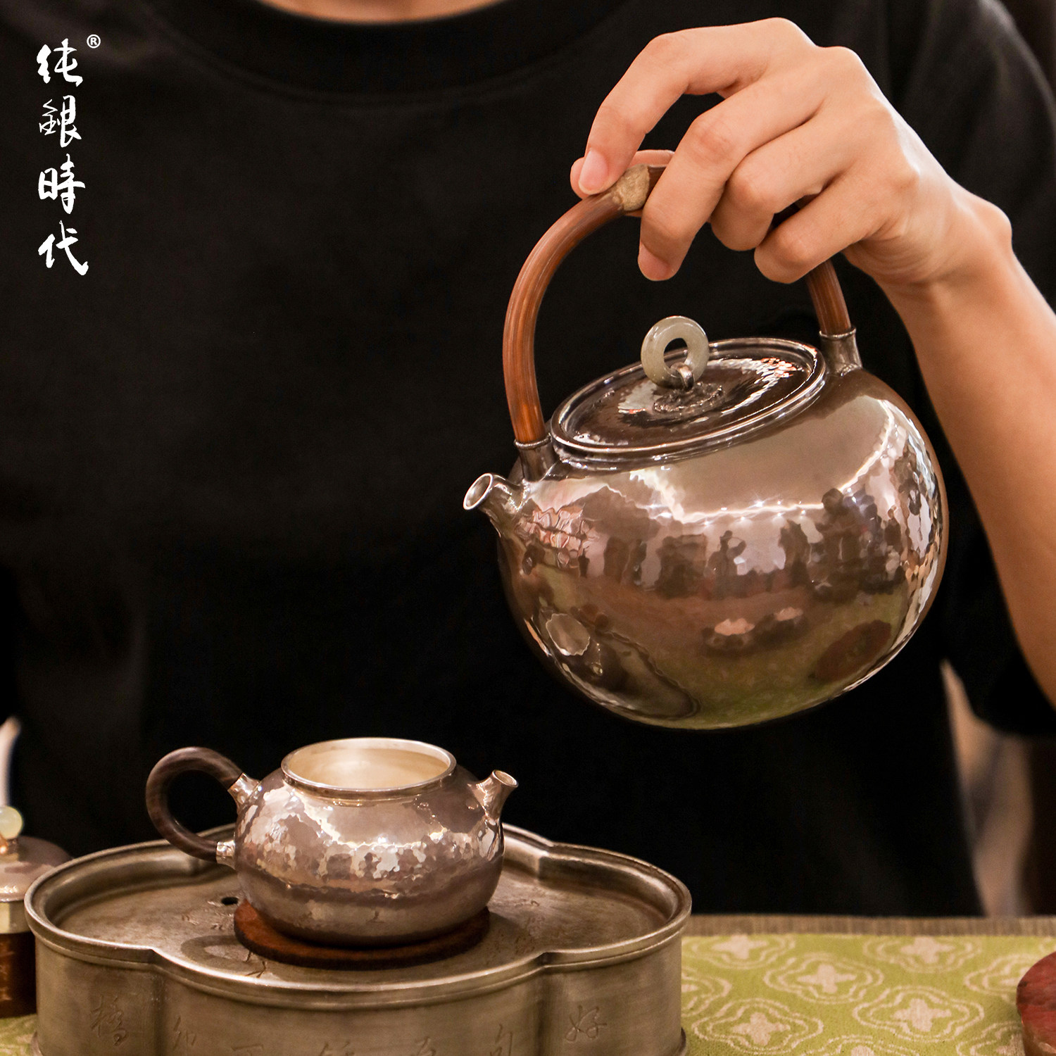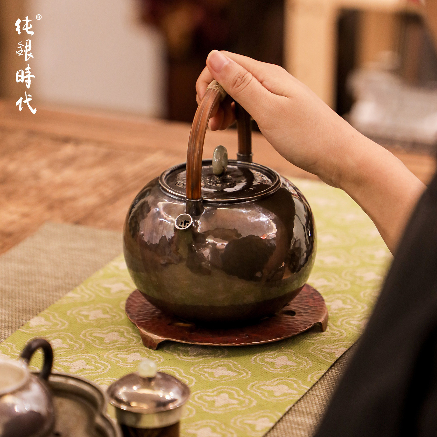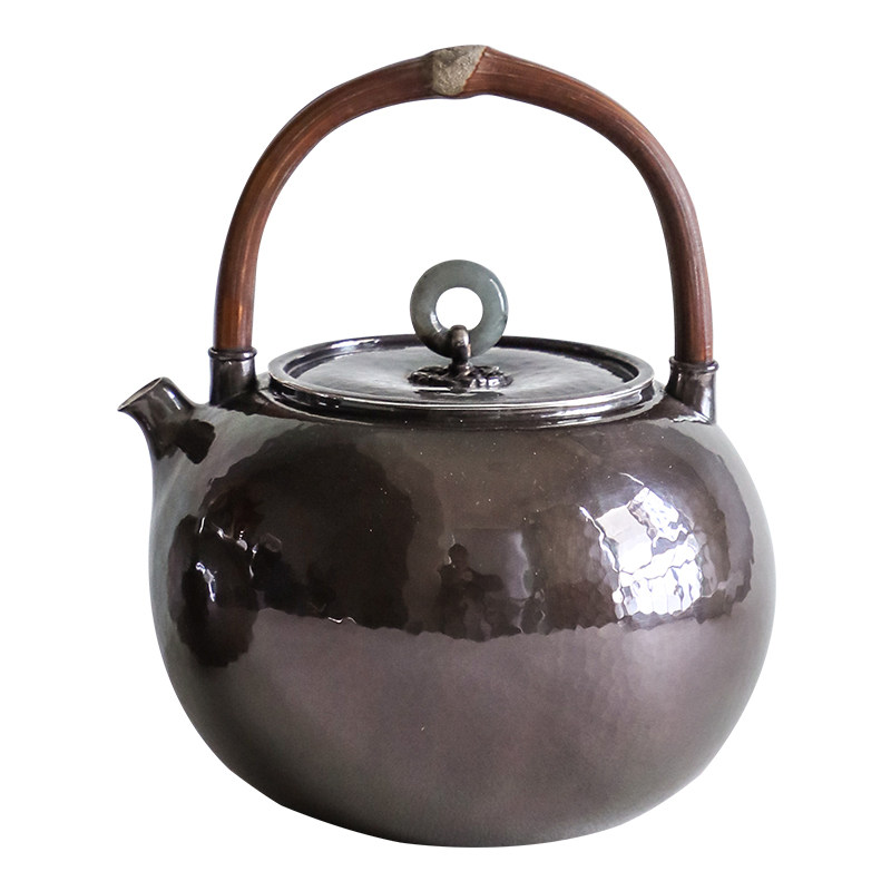 纯银时代 藤提梁紫皮银壶手工一张打足银999煮烧水壶700ml家用