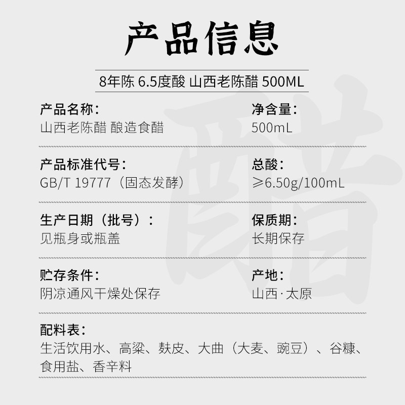紫林8年陈山西老陈醋500ml酿造食醋GB/T19777无添加山西特产6.5度
