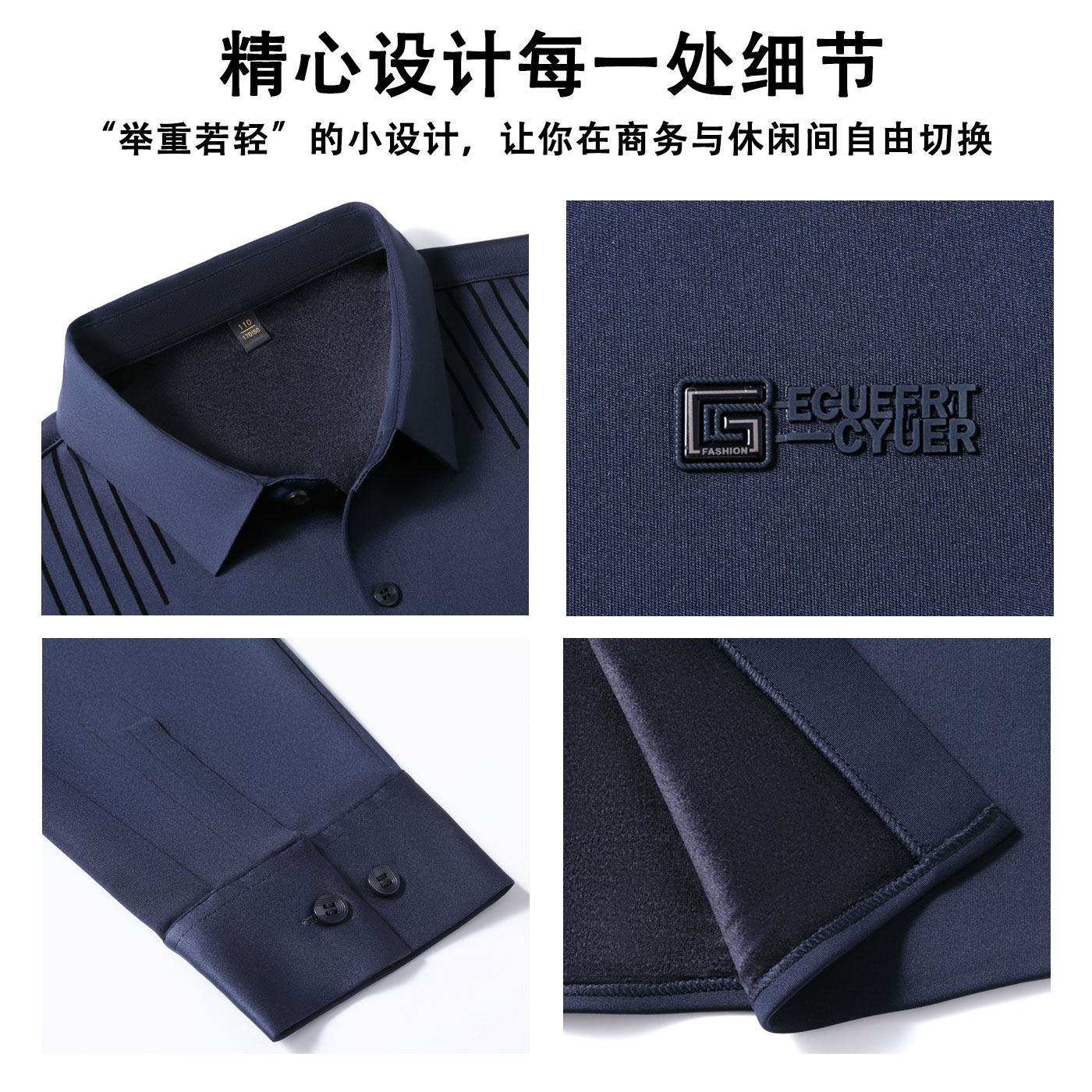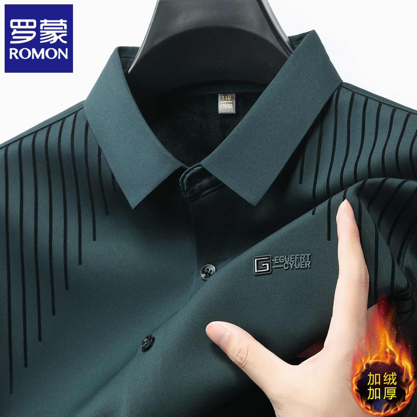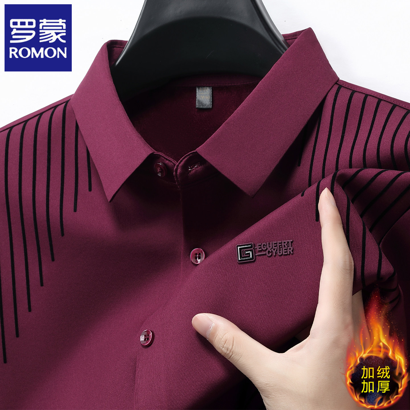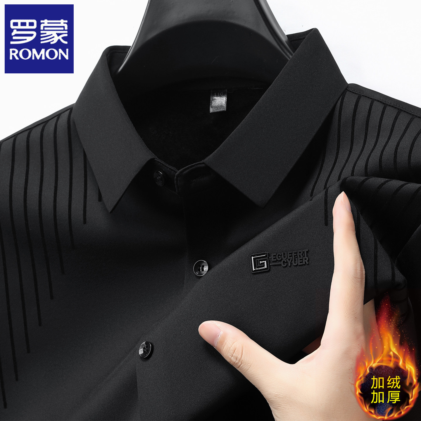 罗蒙冬季新款长袖衬衫男士加绒加厚免烫衬衣中年男装保暖抗皱上衣