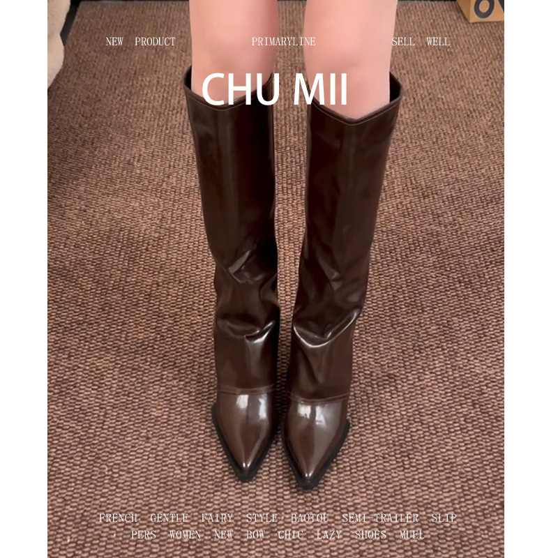 羊皮版~坡跟不过膝长靴女复古棕色尖头裤管靴显瘦长筒骑士靴