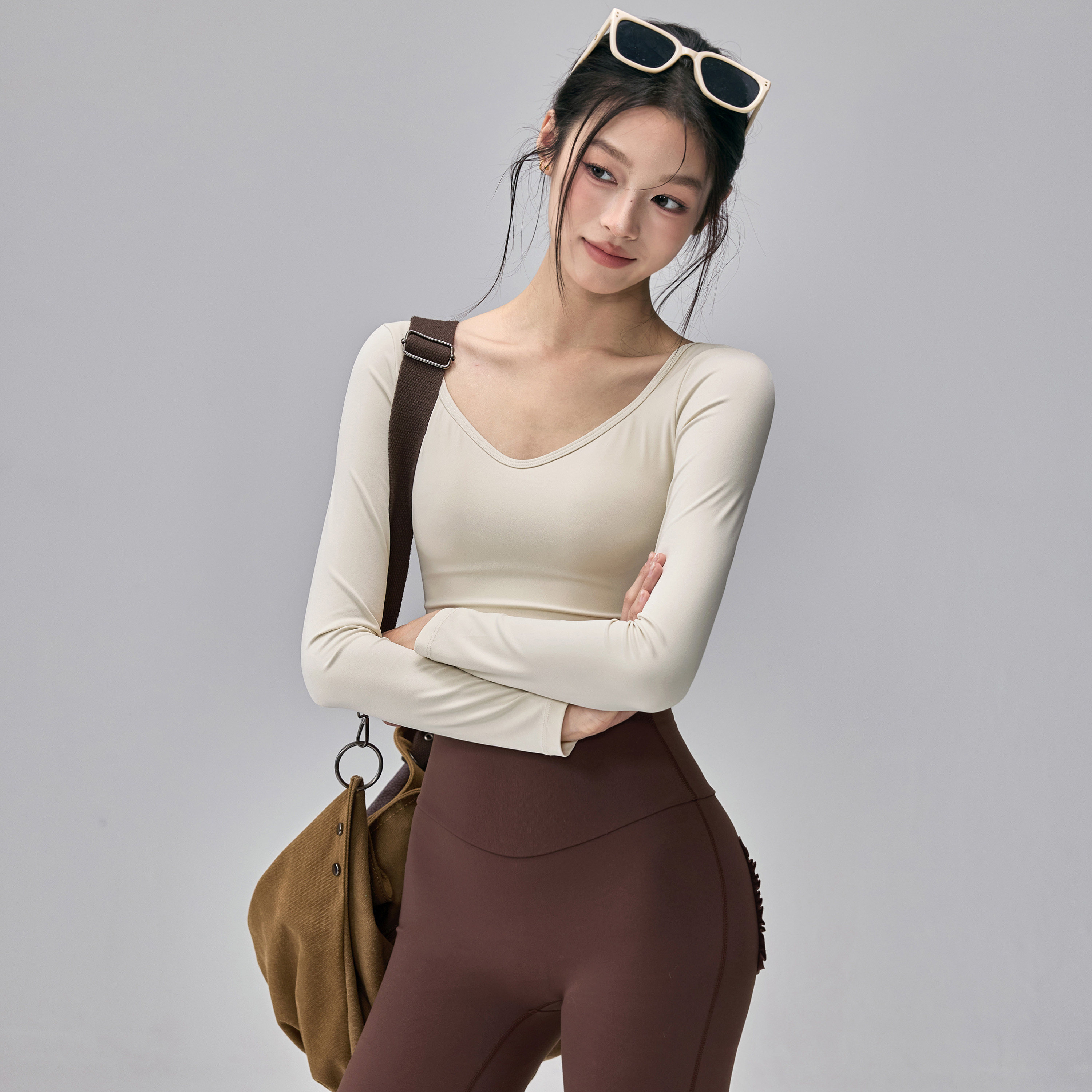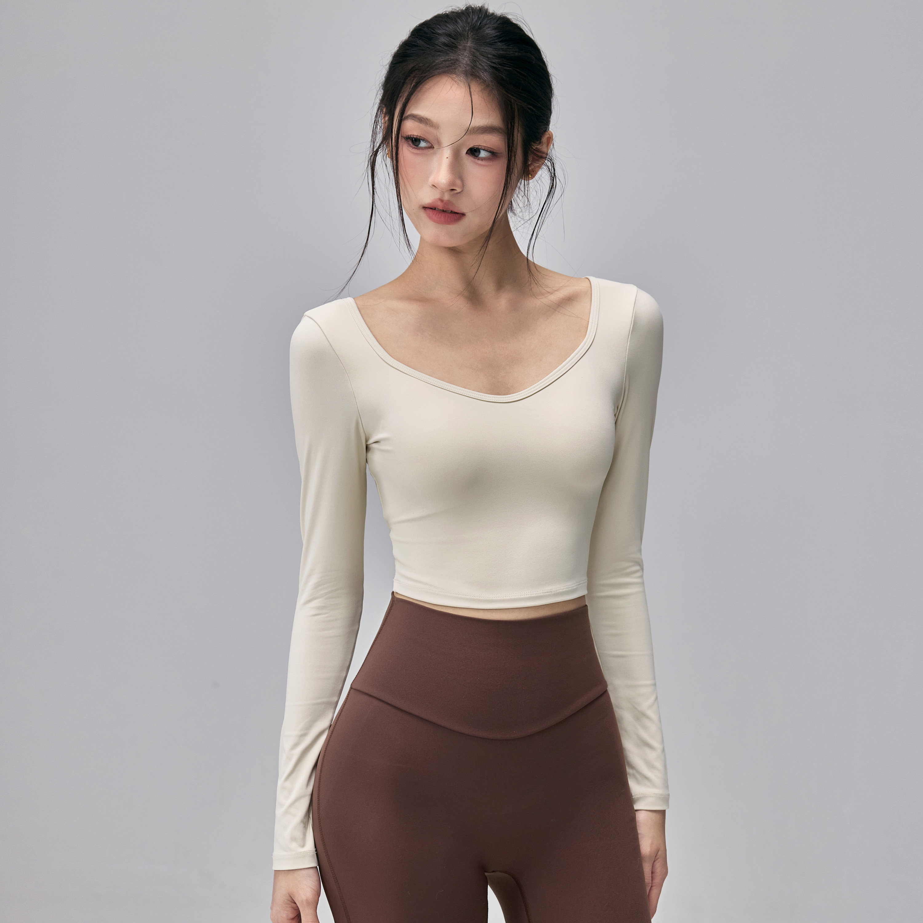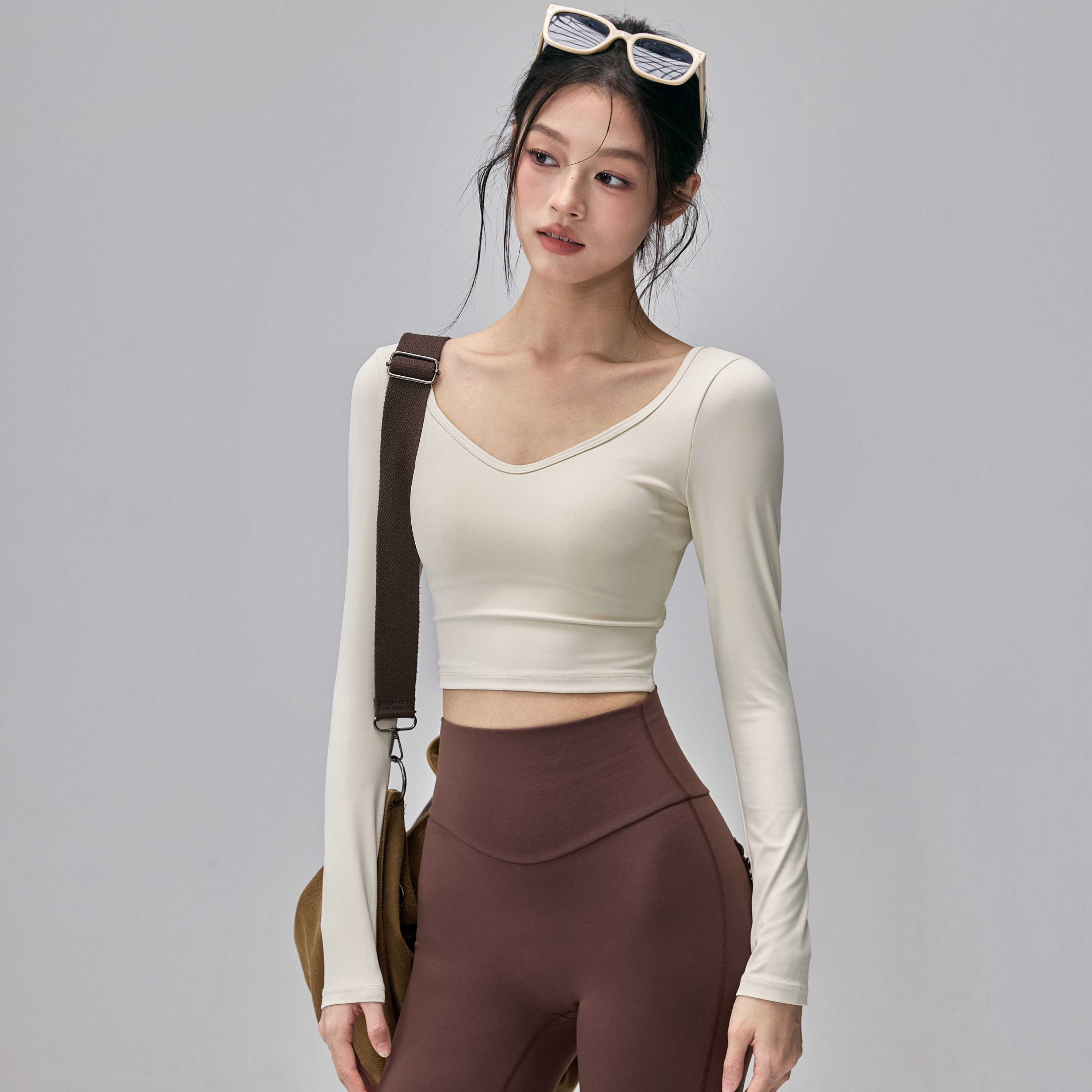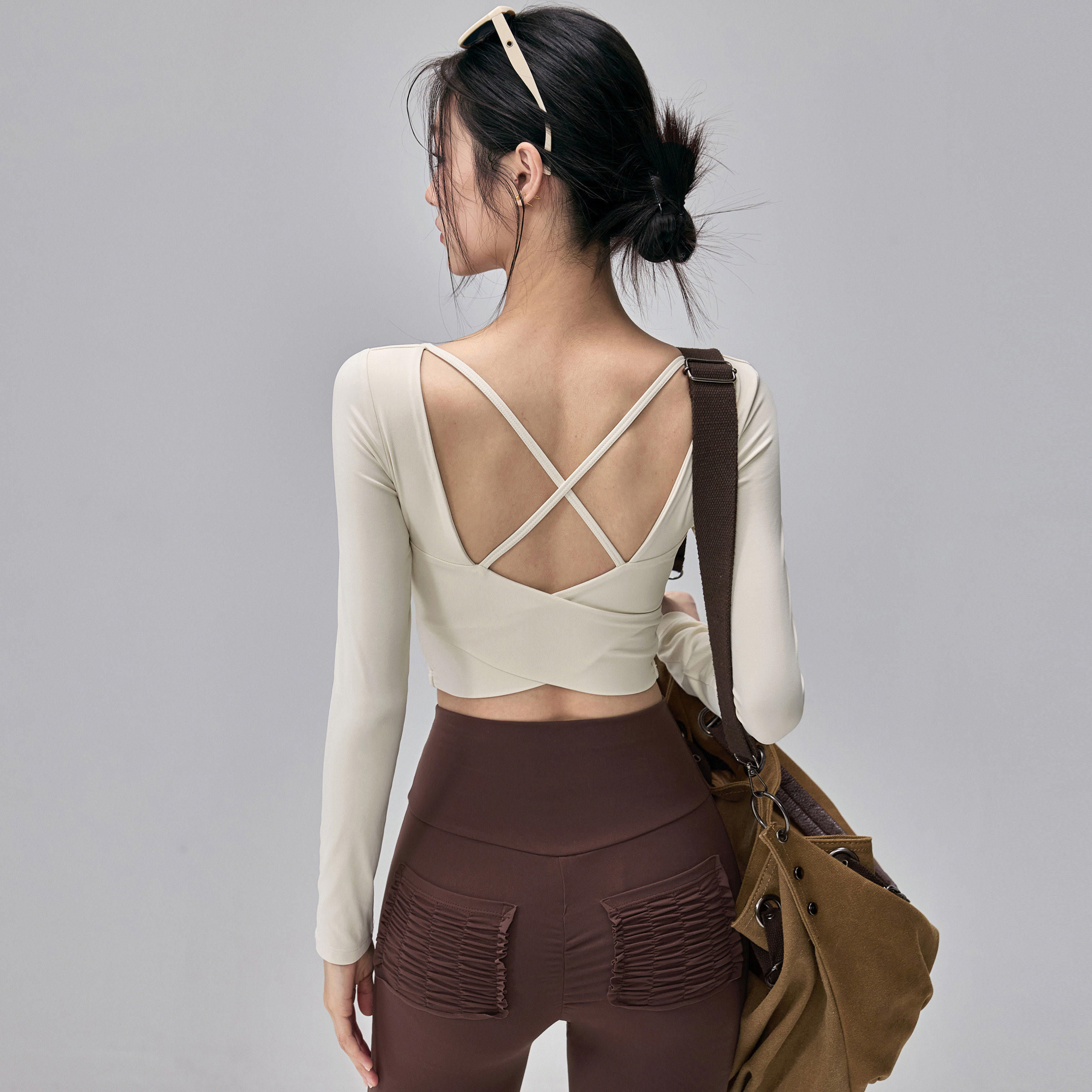 健身女孩美背瑜伽服带胸垫短款普拉提训练上衣紧身高级感运动长袖