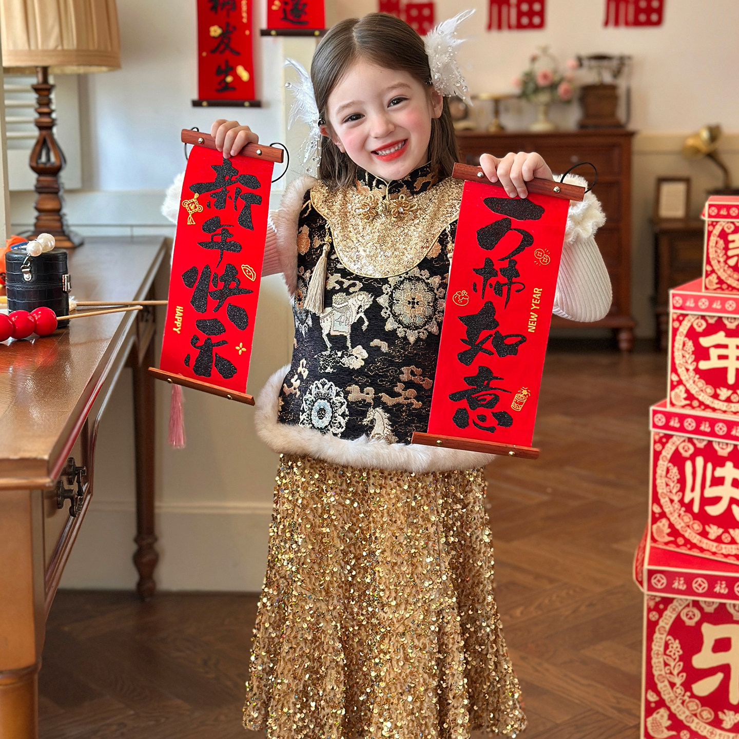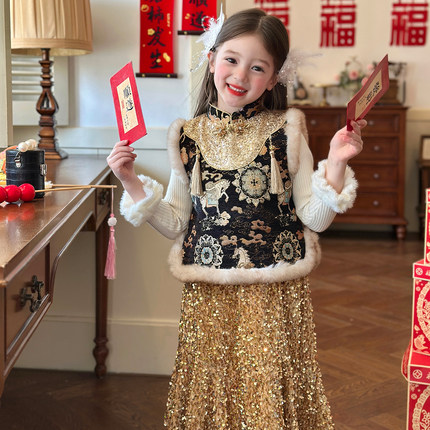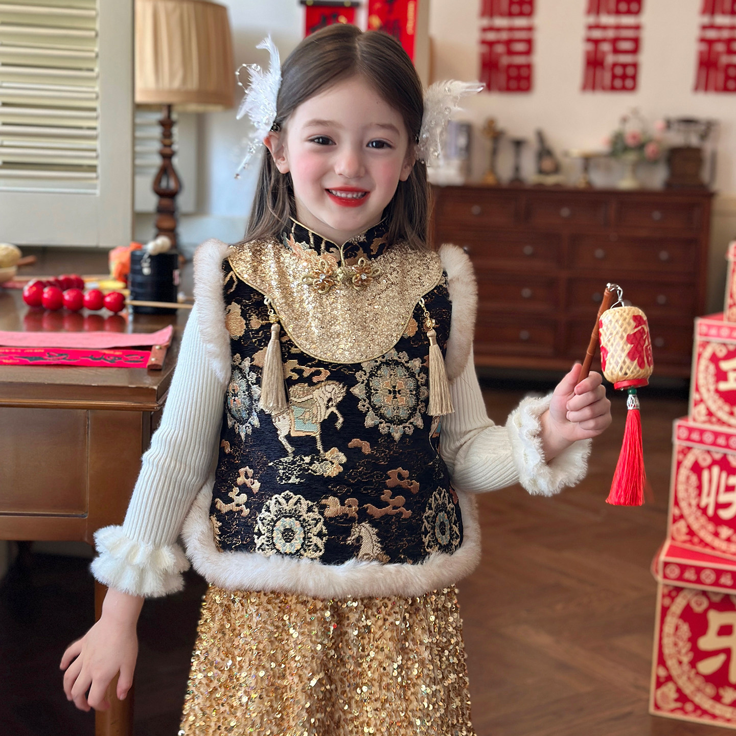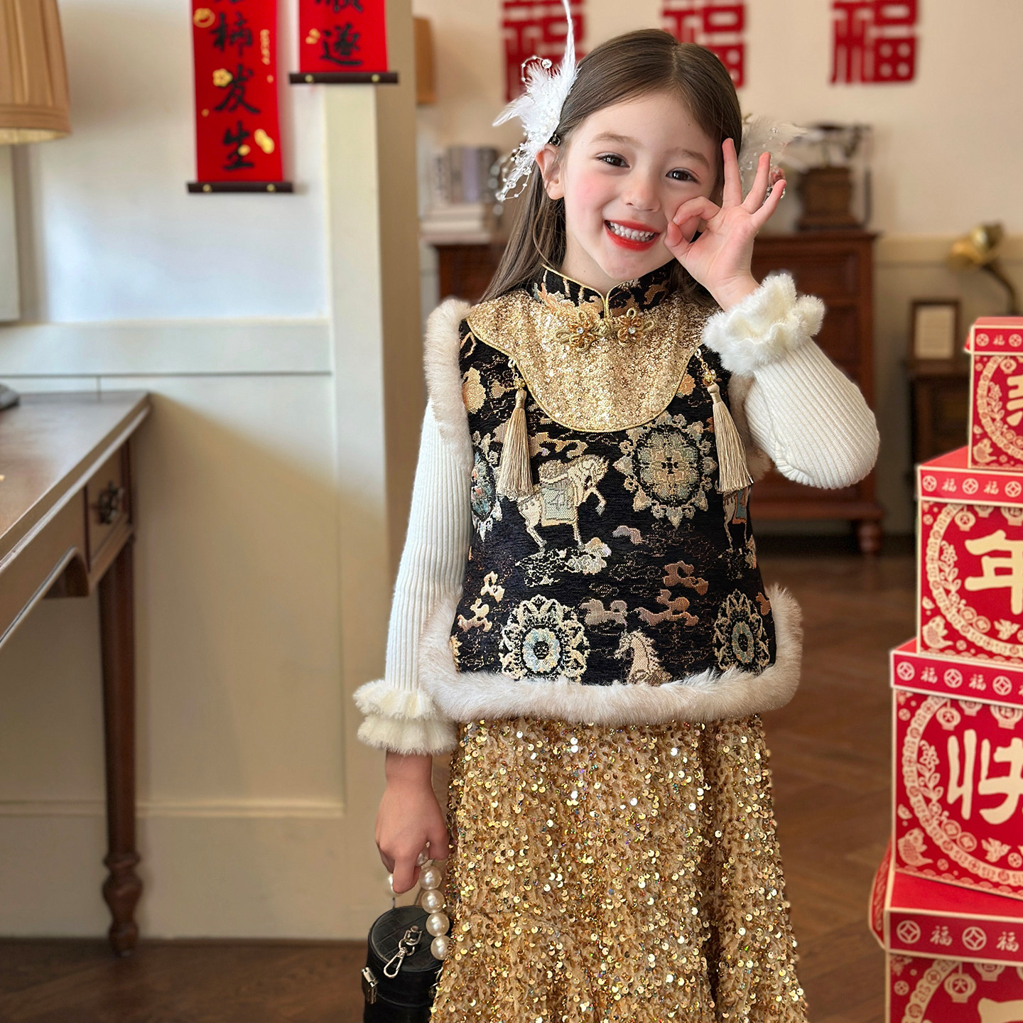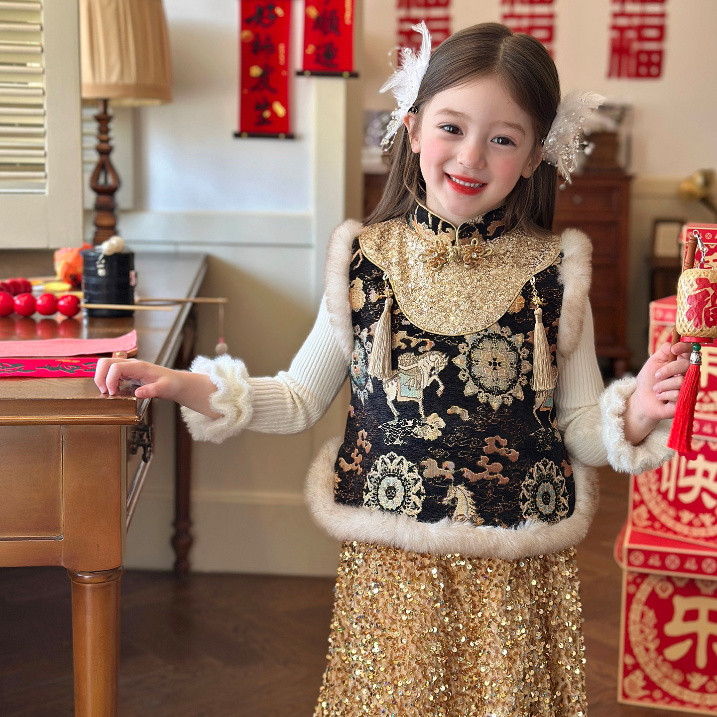 栀了成长记童装女童新年马甲套装2025冬季儿童新中式国风夹棉上衣