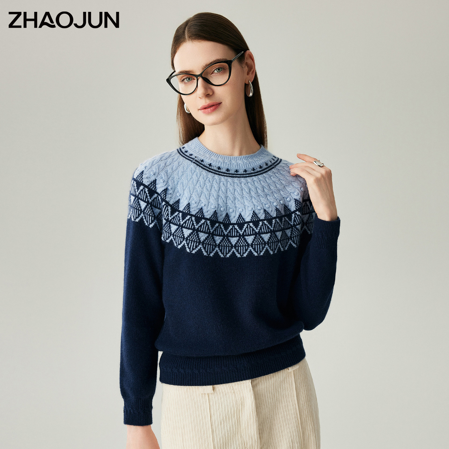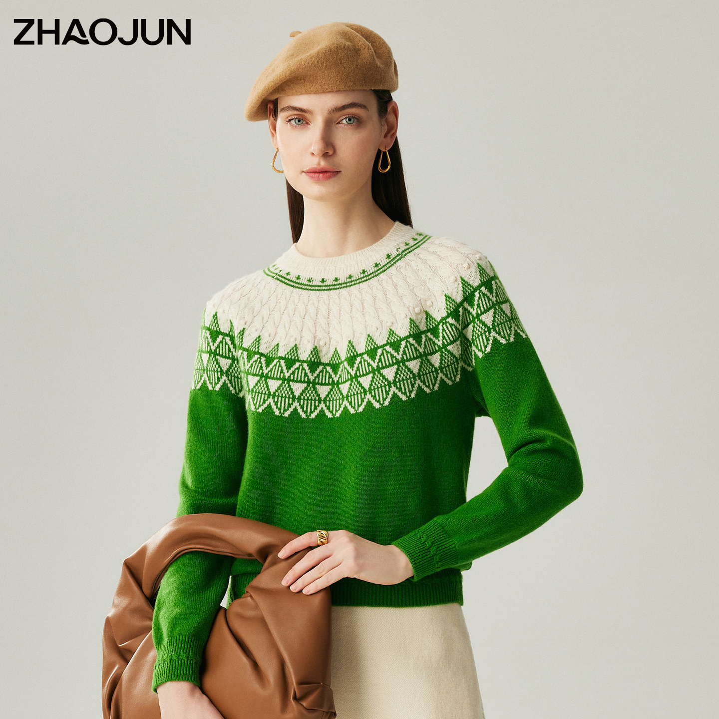 兆君2025秋冬新款费尔岛提花羊绒衫女圆领绞花针织衫加厚打底毛衣