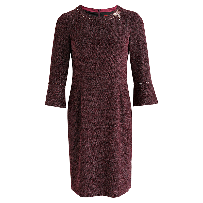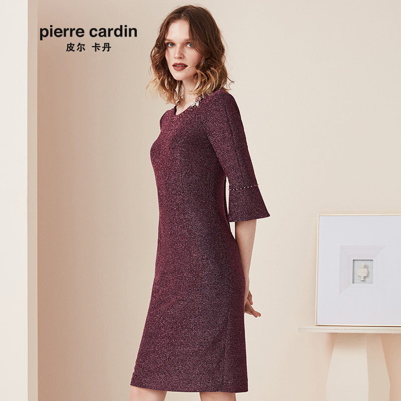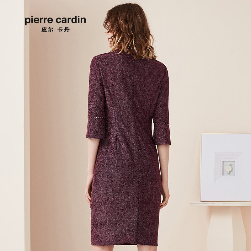 商场同款皮尔卡丹女装秋季新款一步裙紫色九分袖圆领连衣裙