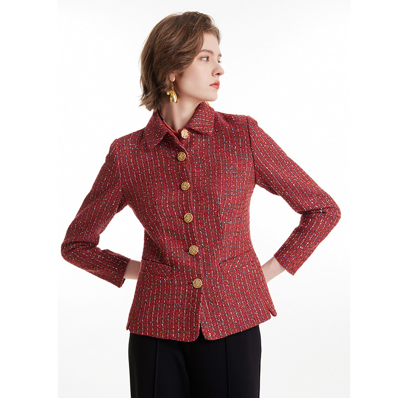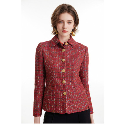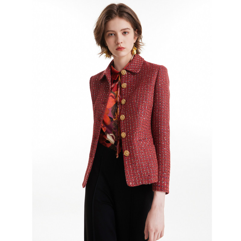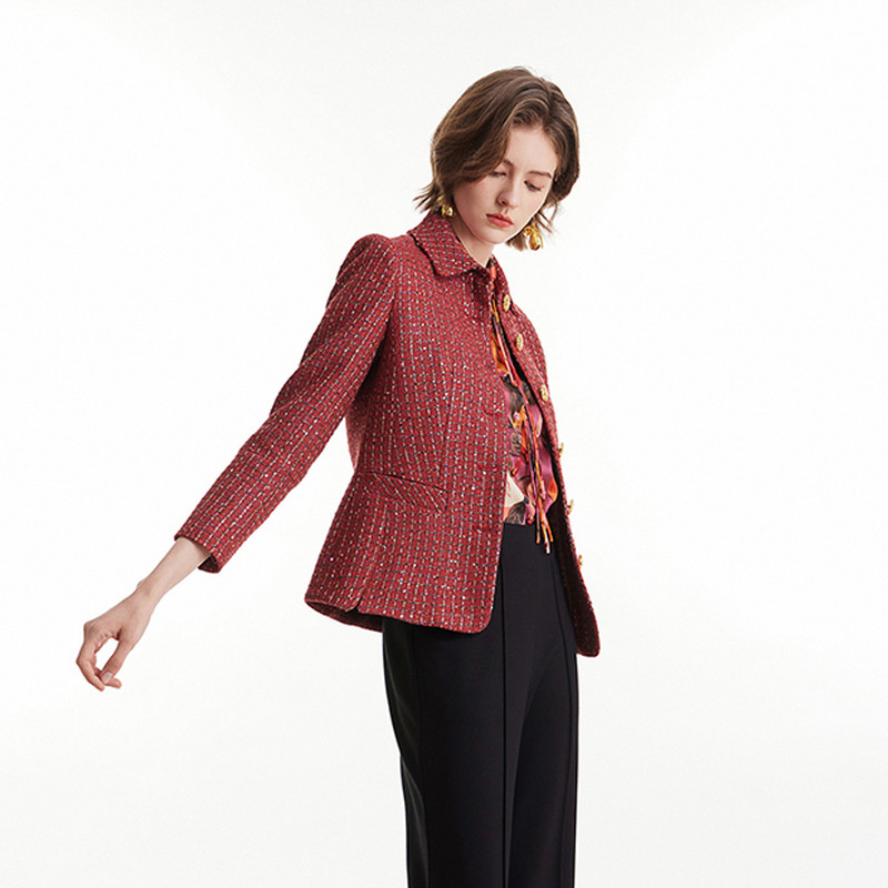 MORELINE沐兰春秋翻领设计感轻奢酒红色编织香风短外套