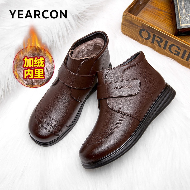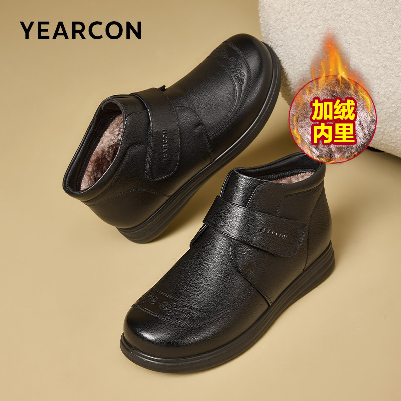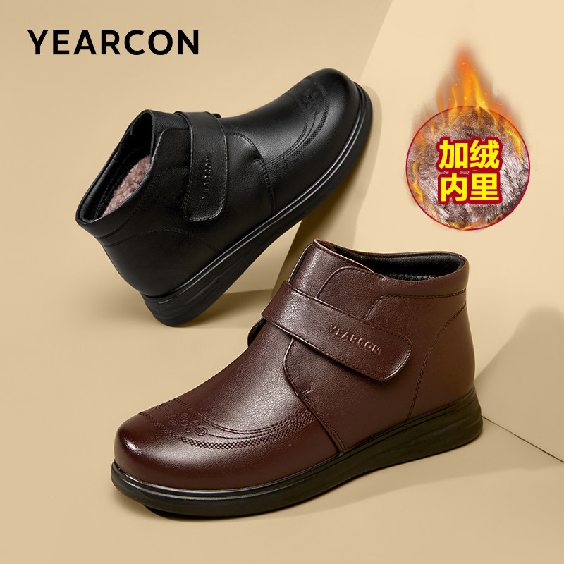 意尔康妈妈鞋子冬季新款加绒加厚软底短靴真皮棉鞋中老年人皮鞋女
