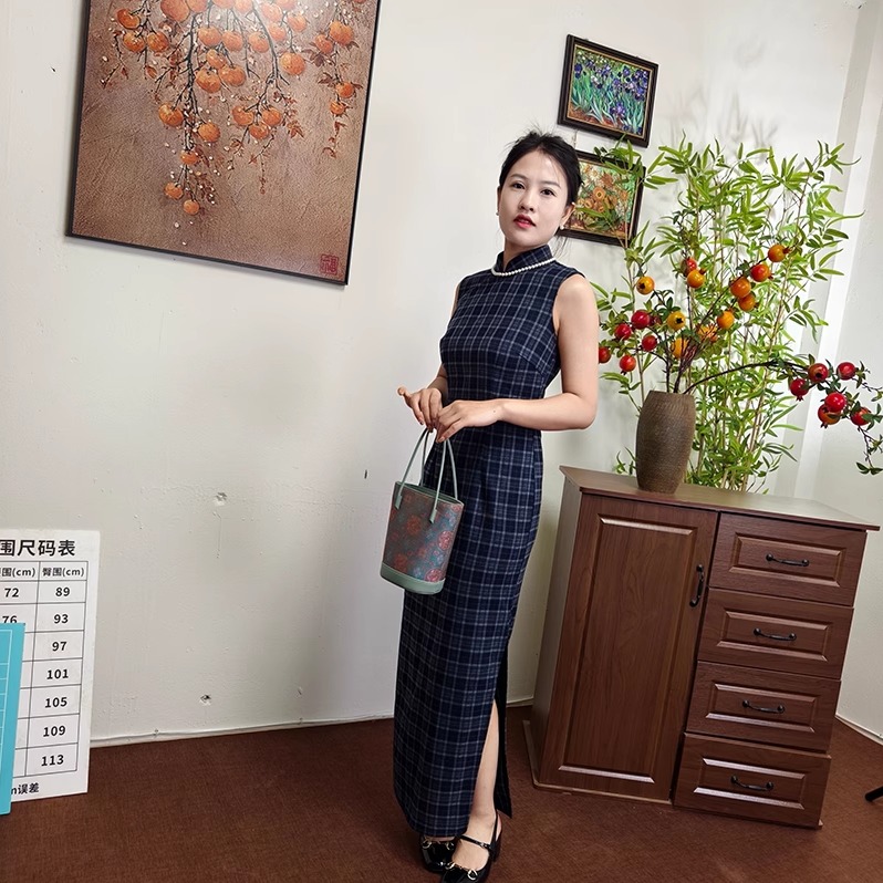 芳华|锦暮溪新品上新复古港风侧拉链收腰显瘦格纹旗袍一片式130