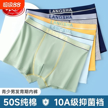 浪莎抗菌青少年内裤纯棉10a高档透气平角裤运动男孩男生四角短裤