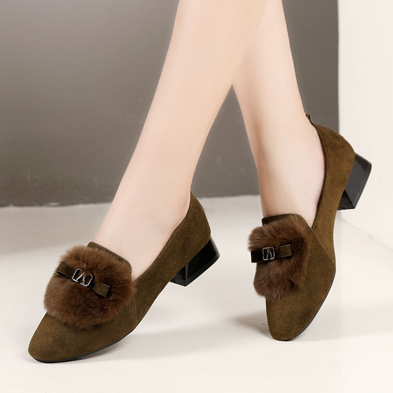 2025新款秋女鞋粗跟单鞋中跟真皮磨砂皮鞋毛毛鞋加绒棉鞋冬豆豆鞋