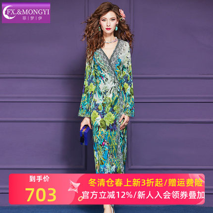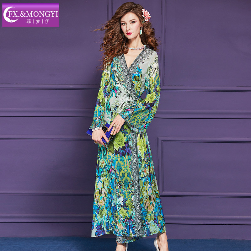 菲梦伊100桑蚕丝绿色印花连衣裙女春季重磅高端真丝镶钻度假长裙