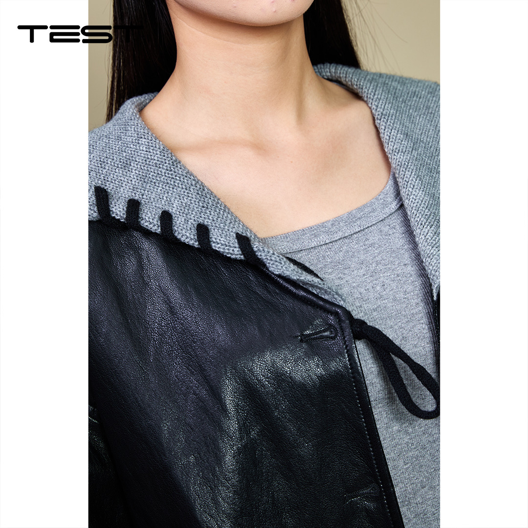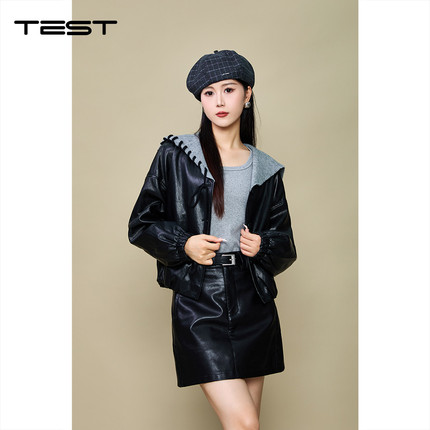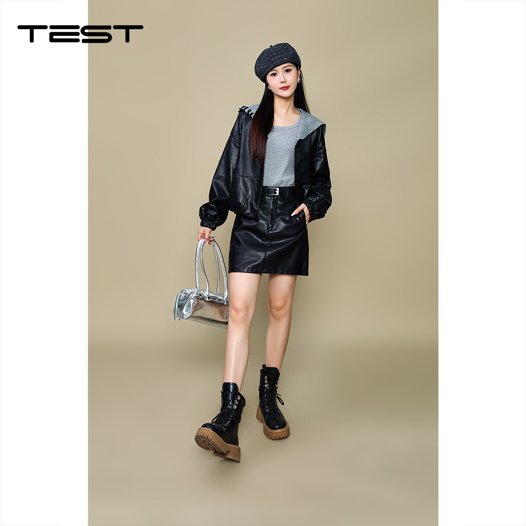 TEST秋新款减龄学院风海军领皮衣外套女宽松pu皮夹克酷飒风外套
