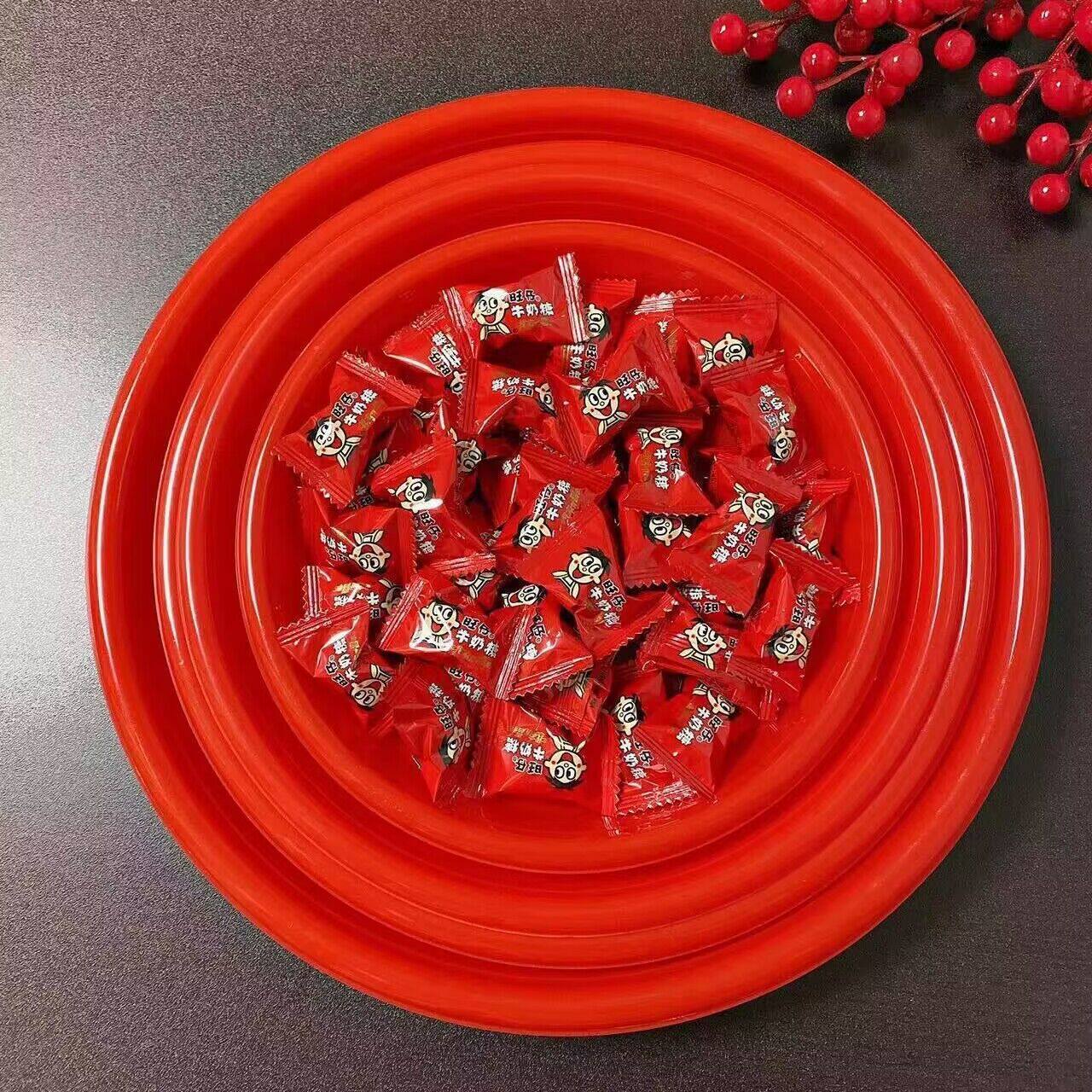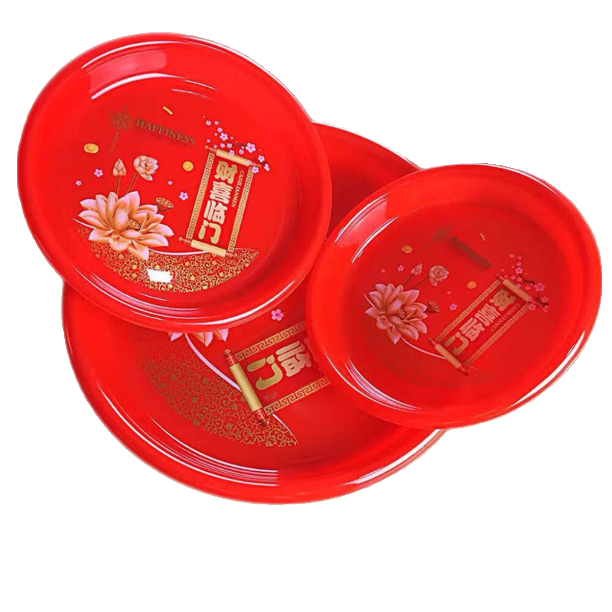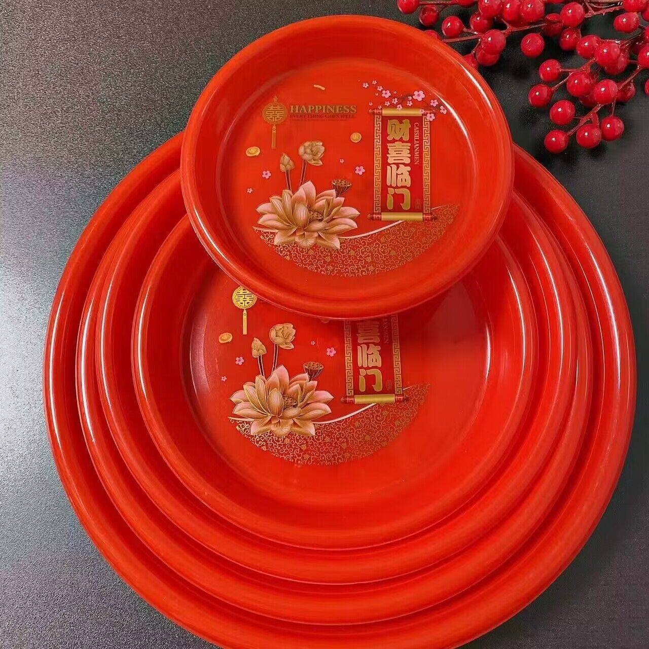 中式塑料喜庆财喜临门供奉结婚婚庆大红加厚加深塑料红盘平底托盘