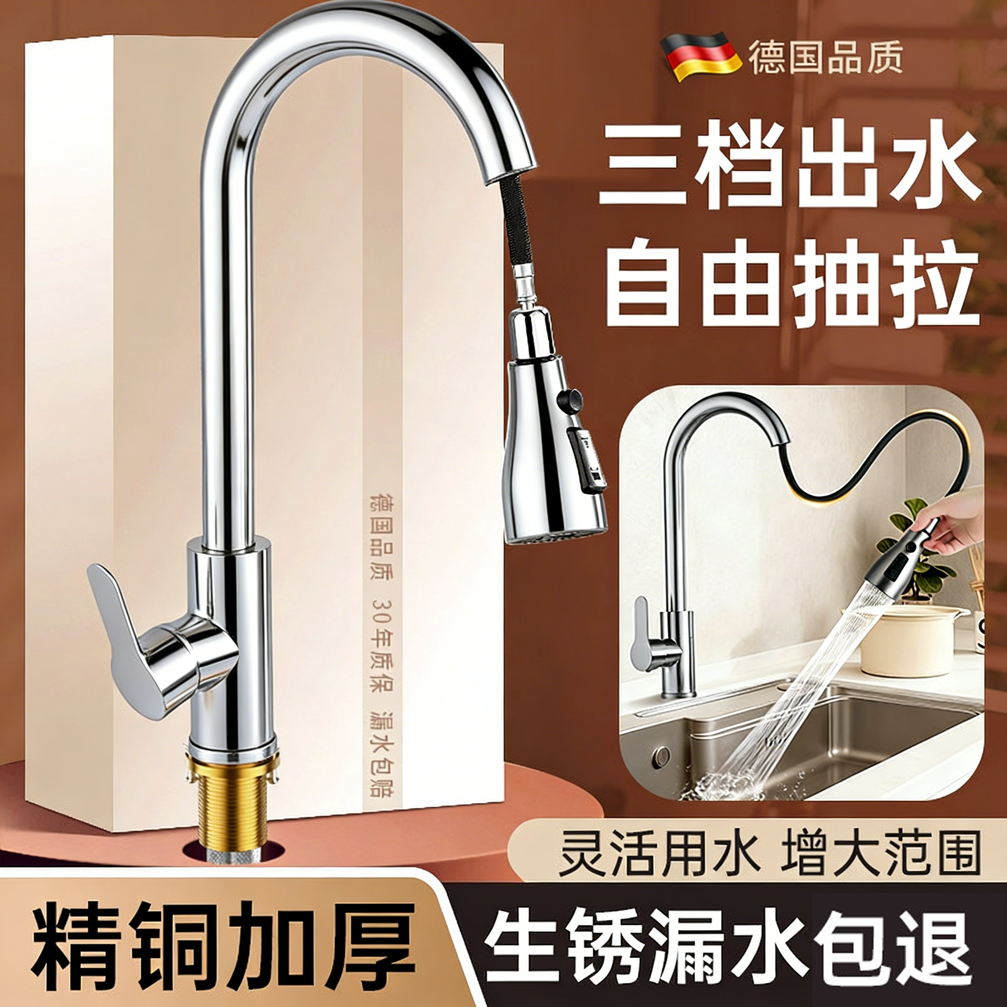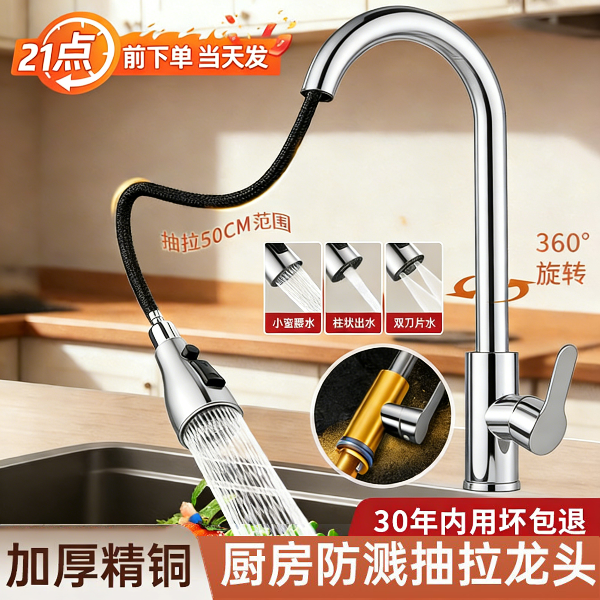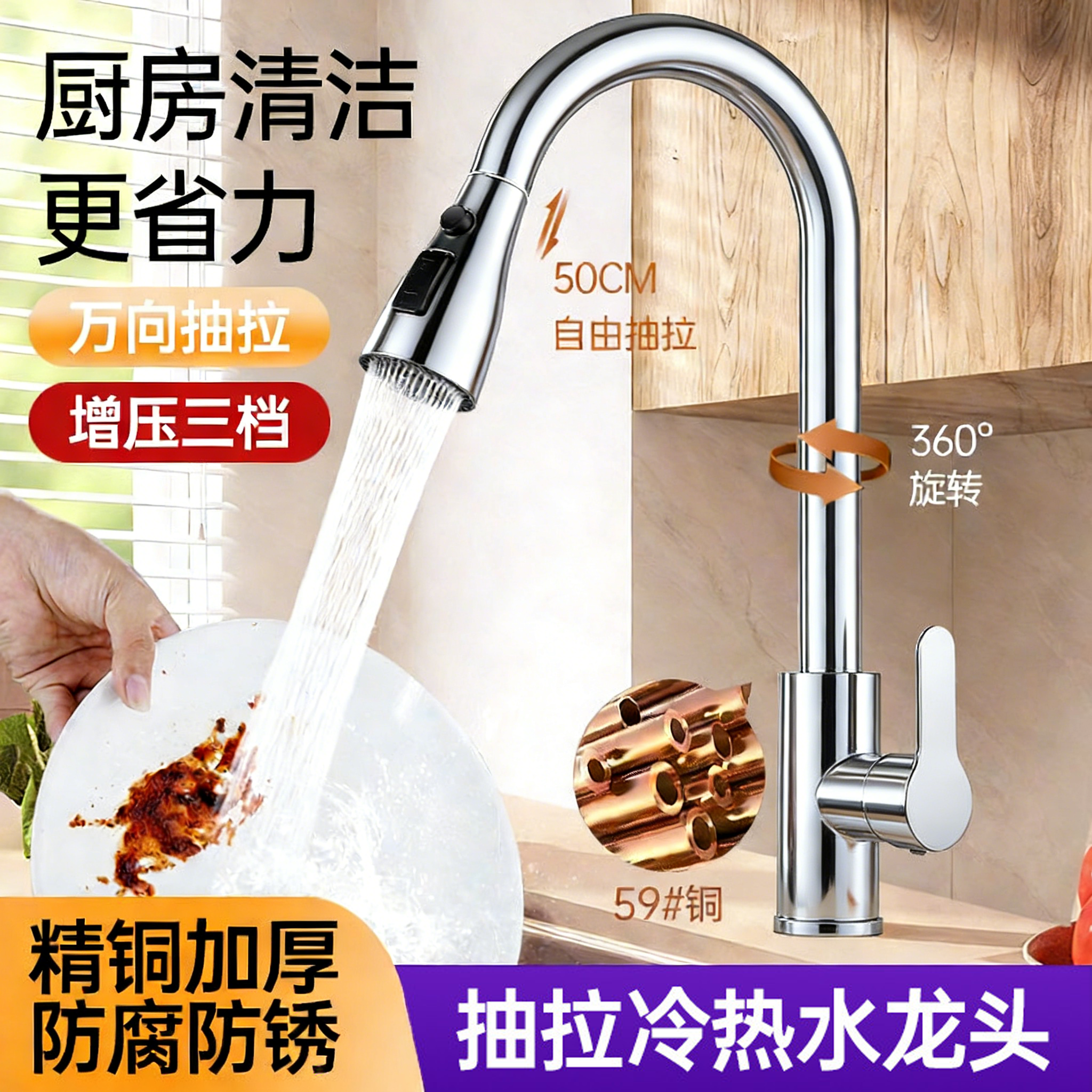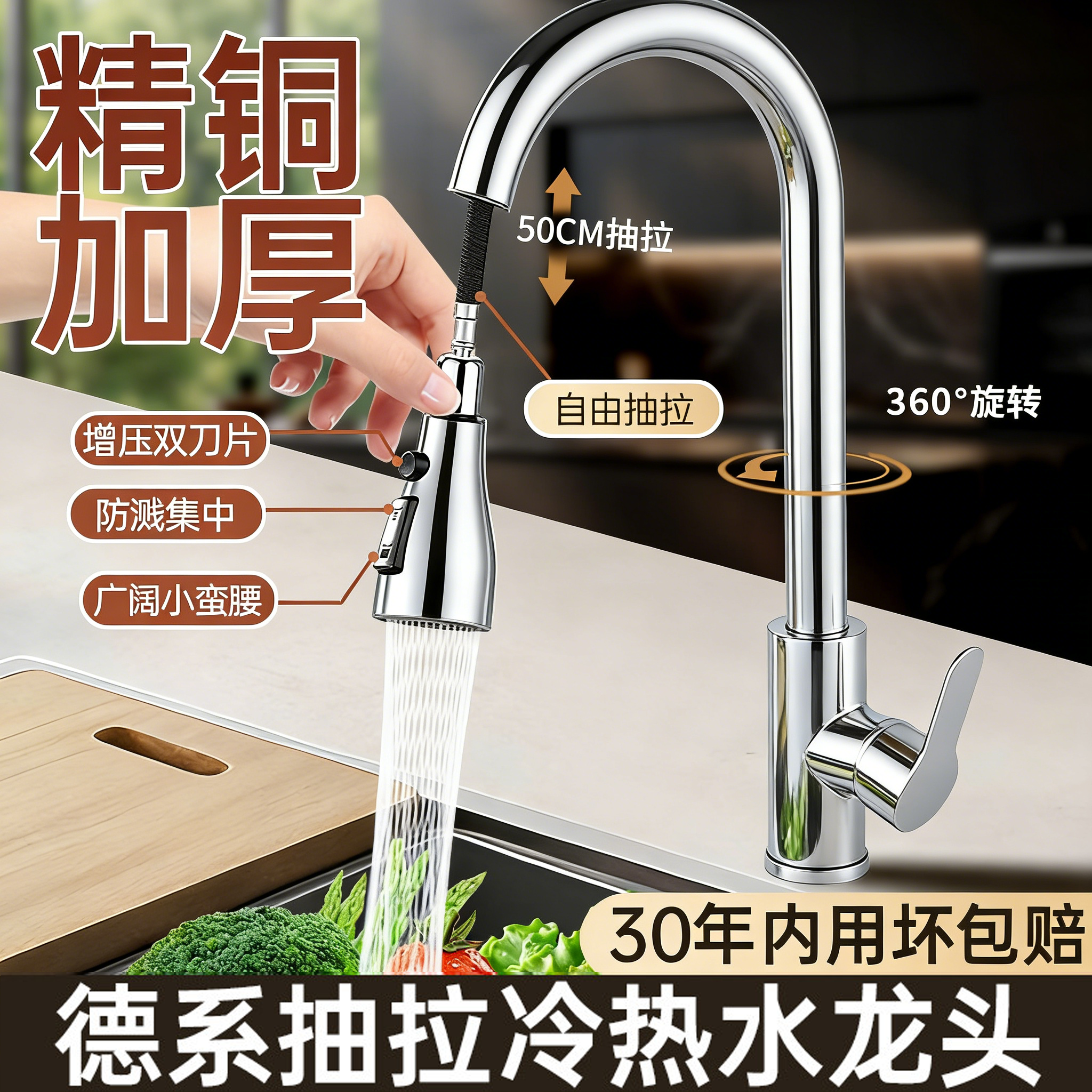 全铜厨房抽拉式水龙头伸缩洗菜盆专用水槽冷热水二合一增压防溅水