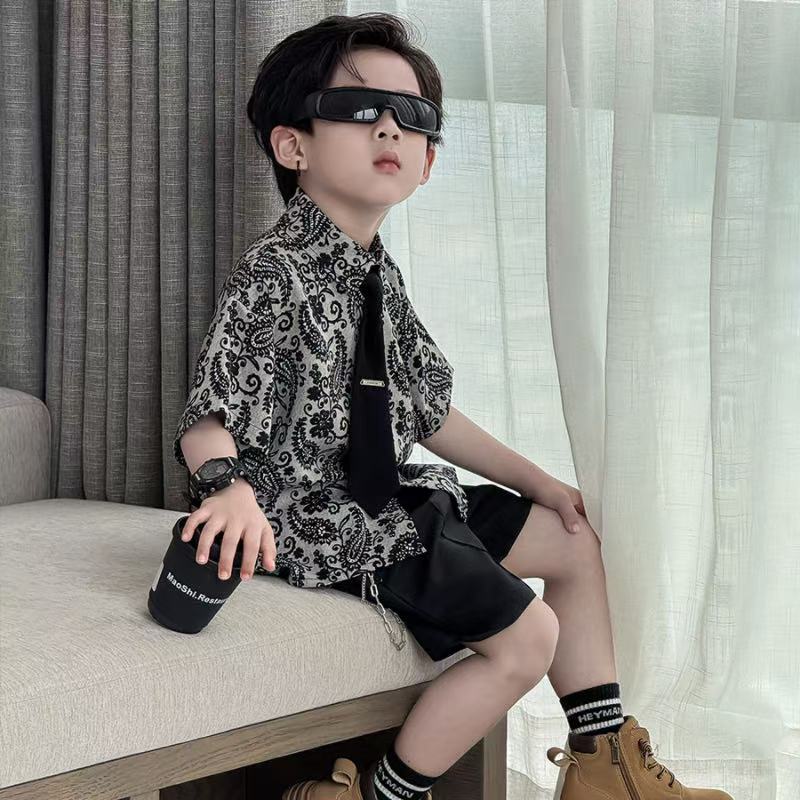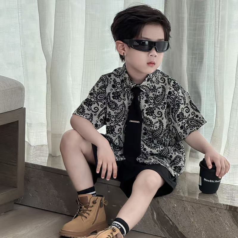 男童套装25新款儿童夏季复古花短袖衬衫两件套中大童男孩休闲上衣