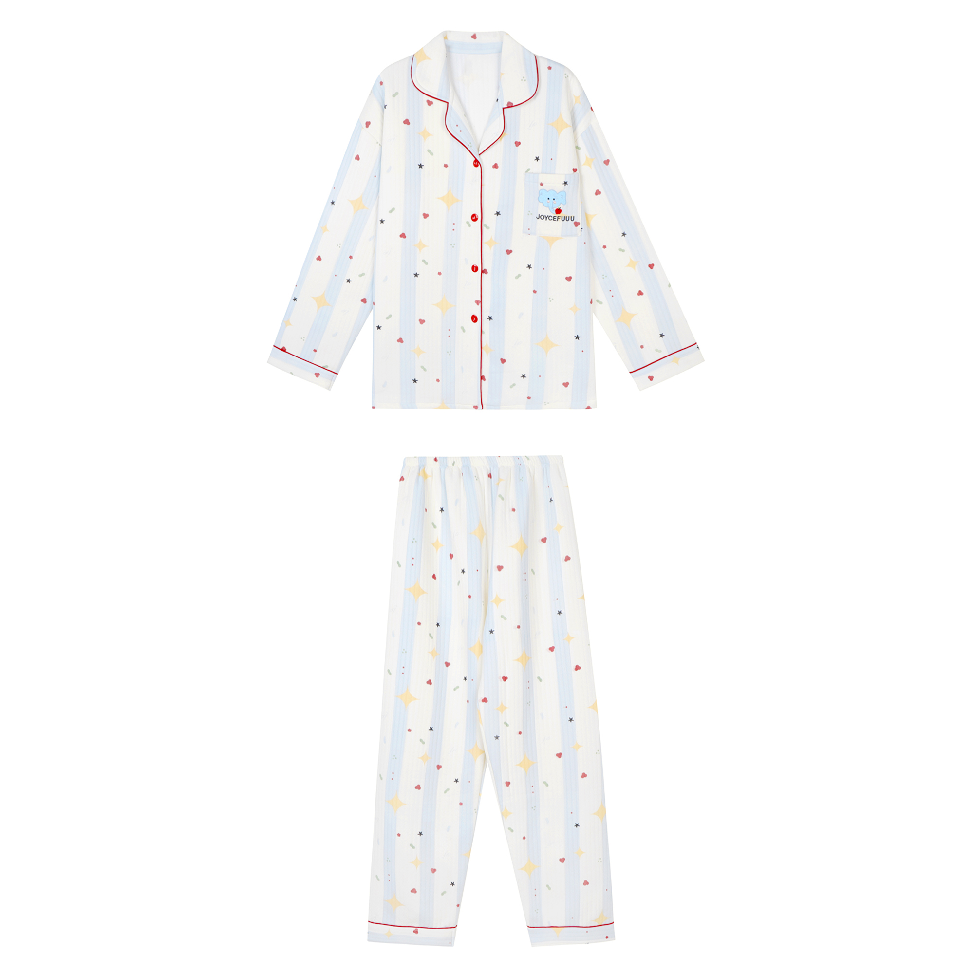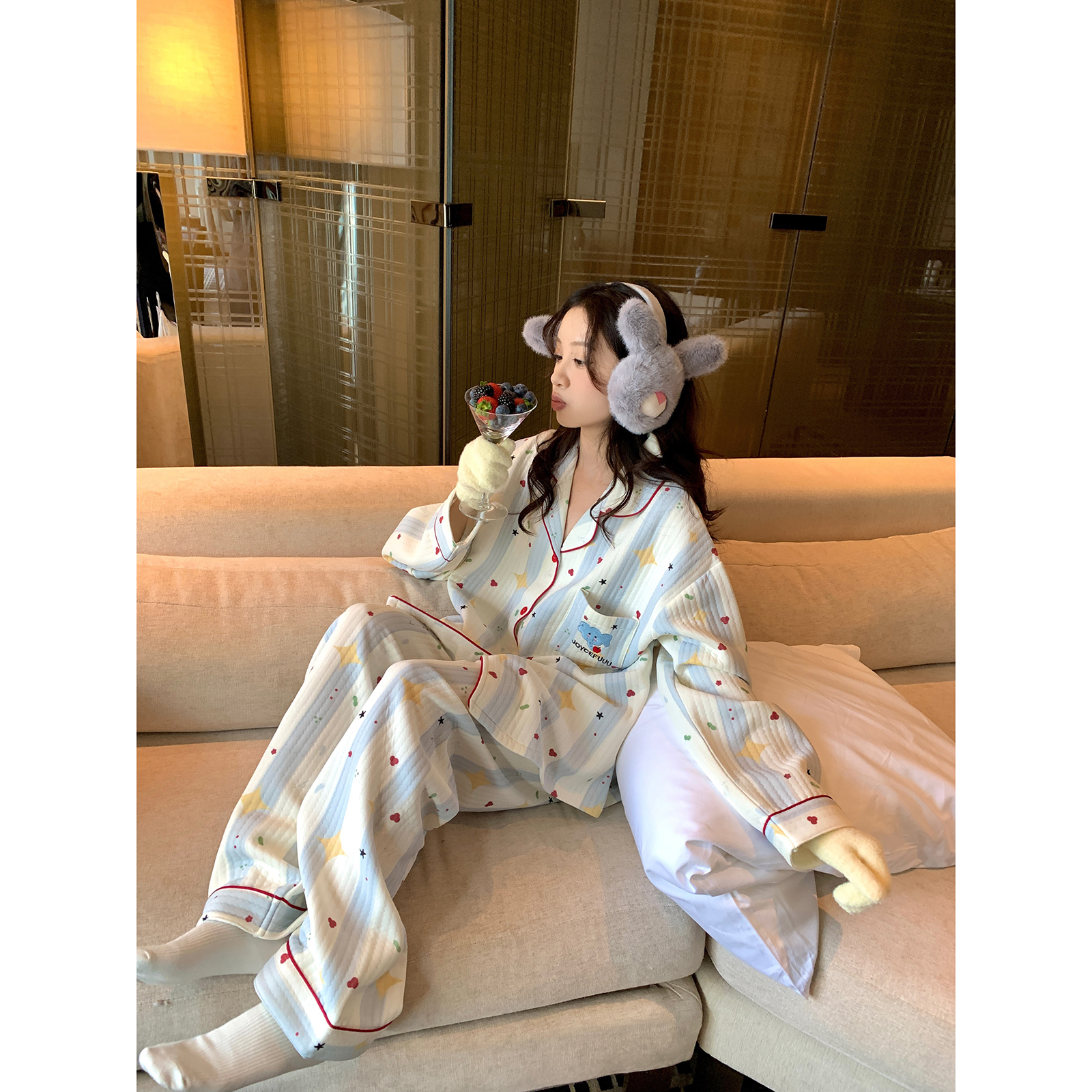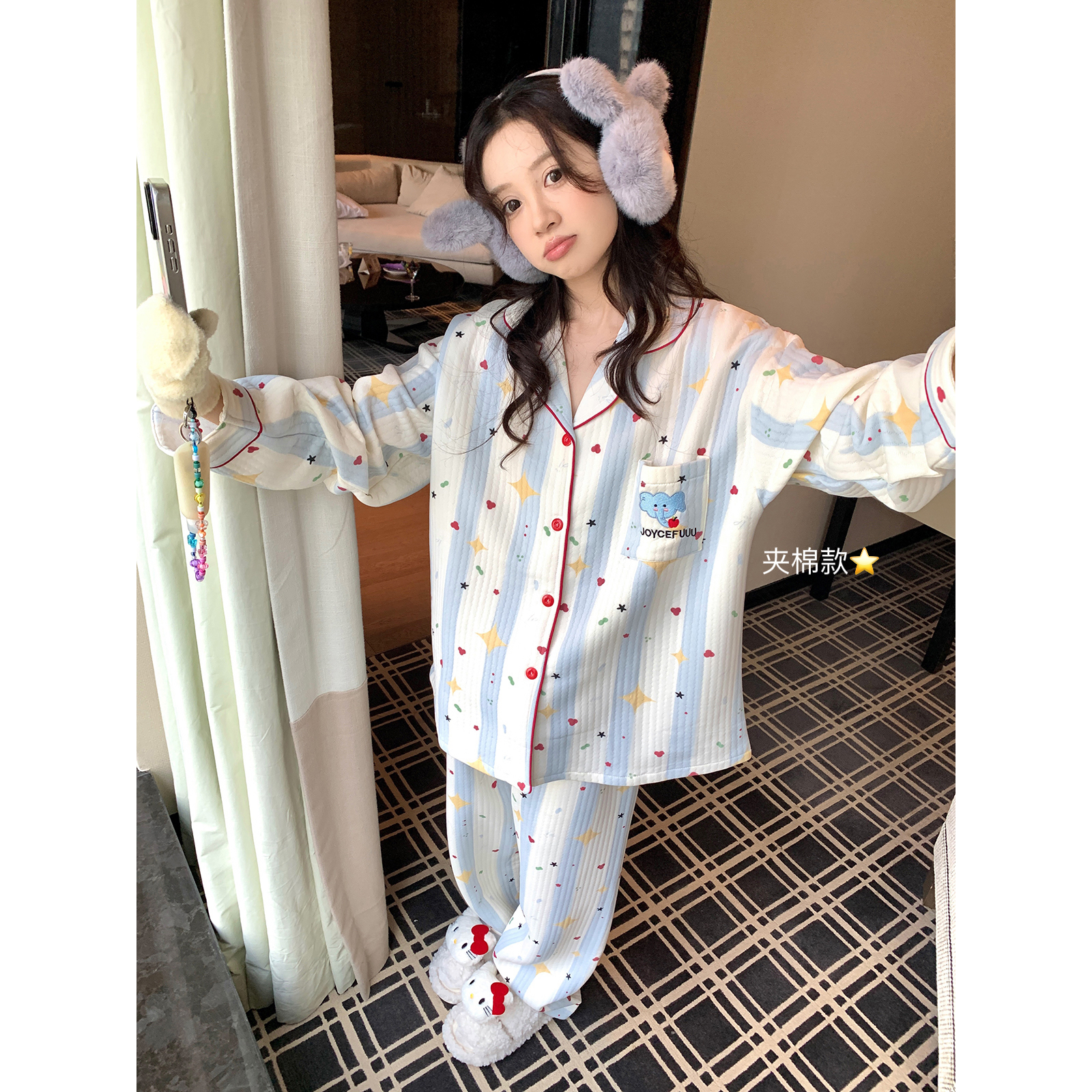 馨帮帮Homedress 卡通条纹夹棉睡衣套装女秋冬款长袖可外穿家居服