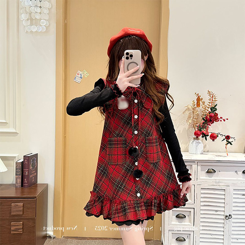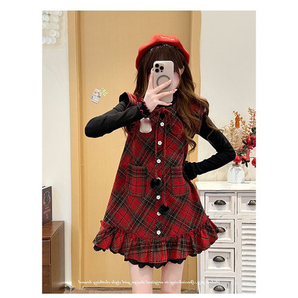 法式学院风新年红色格纹小飞袖背心裙女春季穿搭长袖打底衫两件套
