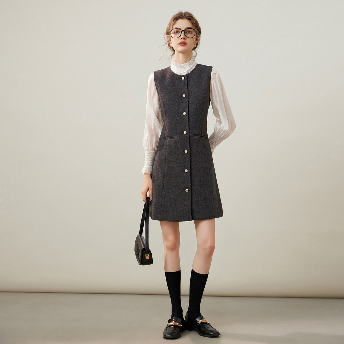 白鹿语优雅毛呢开衫式背心裙25秋冬款气质圆领单排扣无袖连衣裙女