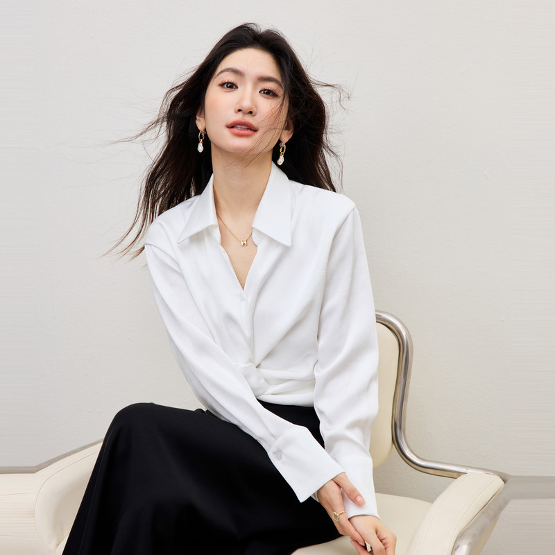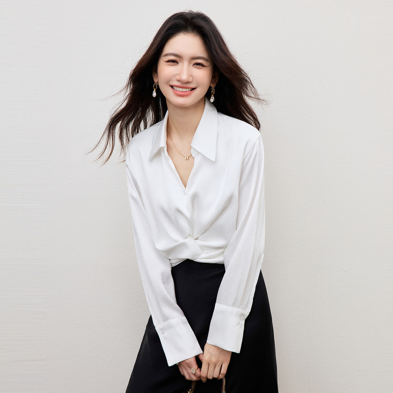 白衬衫扭结长袖女2026春季设计感小众短款洋气小衫多穿法缎面上衣